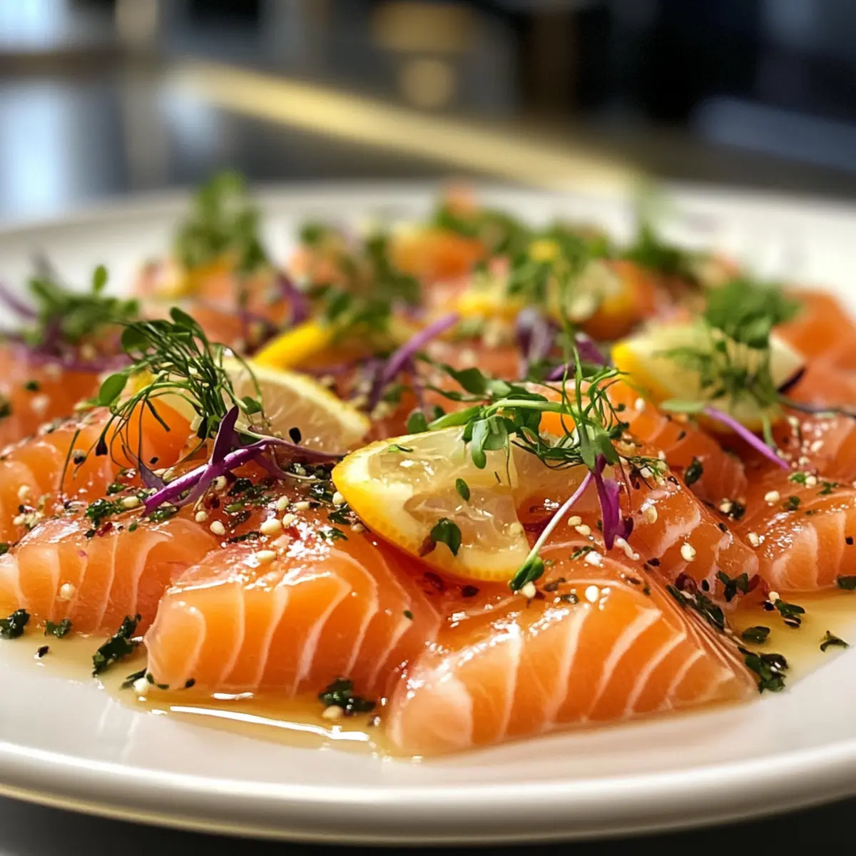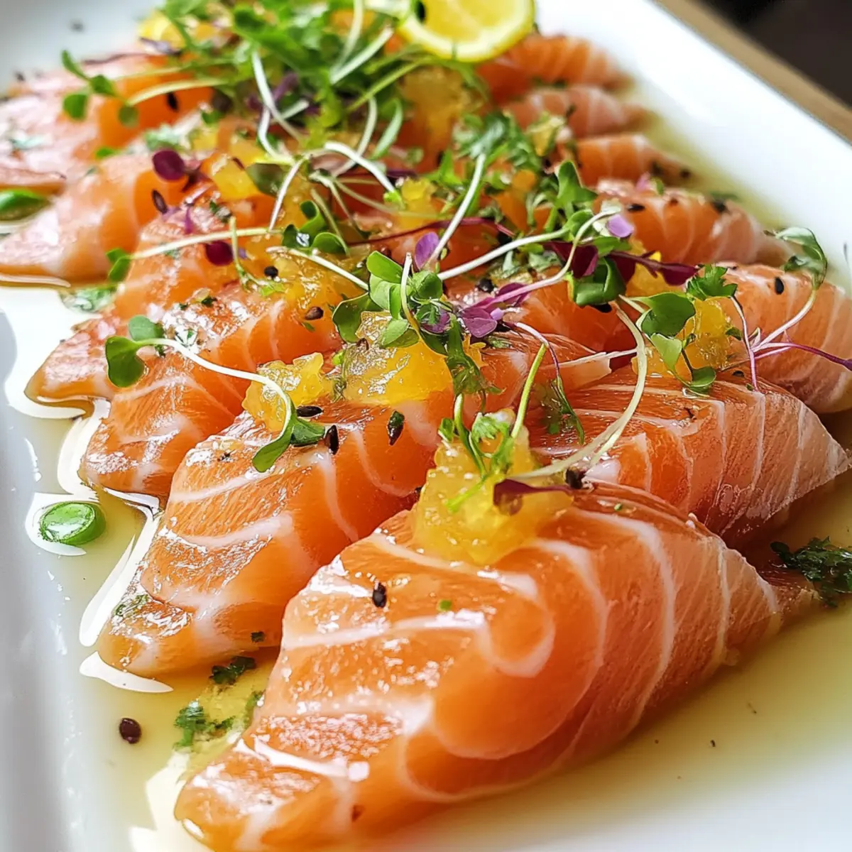 Jump to Recipe Print RecipeAs I stood in my kitchen the other day, a light bulb went off while gazing at the sushi-grade salmon nestled in my fridge. What if I could transform this beautiful fish into a dazzling appetizer without ever turning on the stove? Enter the Salmon Crudo with Citrus Soy Dressing—a no-cook delight that brings the taste of fine dining right to your table. This dish not only showcases the buttery richness of fresh salmon but also features a vibrant dressing that balances citrus brightness with a hint of umami, making it a standout party starter or a classy addition to any dinner. Best of all, it’s gluten-free and easy to whip up, perfect for impressing guests or treating yourself. Curious to learn how to elevate your appetizer game? Let’s dive in! Why is Salmon Crudo a Must-Try? Effortless preparation makes this dish a gem for home cooks. Just slice, mix, and serve—no kitchen skills required! Zesty citrus soy dressing elevates the rich salmon, bringing an exciting flavor combination you’ll crave. Impressive presentation will wow your guests at any gathering—perfect for dinner parties! Pair it with Thai Chicken Dressing or a light salad for a complete meal. Plus, it’s a nutritious choice, low in carbs and packed with healthy fats. Enjoy this fresh, vibrant appetizer that delivers gourmet taste with minimal effort! Salmon Crudo with Citrus Soy Dressing Ingredients For the Crudo Raw Salmon (6-8 oz.) – The star of this dish; sushi-grade salmon ensures a fresh and safe serving. Shallot (1, very small) – Adds a mild onion flavor; mince finely for even distribution in the dressing. For the Dressing Extra Virgin Olive Oil (2 tablespoons) – Enhances flavor while maintaining a light taste; opt for high-quality for the best results. Lemon (½, juiced) – Provides essential acidity; freshly squeezed is key—about 2 tablespoons of juice offers maximum brightness. Lime (½, juiced) – Complements the lemon’s tartness; use fresh juice for that extra zing—approximately 2 tablespoons. Soy Sauce (1 tablespoon) – Infuses umami richness; choose tamari for a gluten-free alternative that fits the Salmon Crudo with Citrus Soy Dressing perfectly. For Garnishing Scallions, chives, or microgreens – Adds a fresh crunch and beautiful color to the dish; choice of garnish can elevate presentation. Flaky salt (optional) – A sprinkle enhances flavors and contrasts the silky salmon. Step‑by‑Step Instructions for Salmon Crudo with Citrus Soy Dressing Step 1: Prepare the Shallot Begin by finely mincing the shallot, aiming for a texture that blends seamlessly into the dressing. Use a sharp knife for precision, and place the minced shallot in a small bowl. Set aside to allow the flavors to meld and intensify as you progress with the Salmon Crudo with Citrus Soy Dressing. Step 2: Juice the Citrus Next, juice half a lemon and half a lime into a measuring cup, ensuring to catch any seeds. Aim for around two tablespoons of each juice, which will provide the perfect tangy balance. Fresh juice is essential, so use a citrus juicer for efficiency. Set this vibrant mix aside; it’s the heart of your dressing. Step 3: Slice the Salmon With a sharp knife, slice the sushi-grade salmon against the grain into ¼ inch thick pieces. The ideal slices will be smooth and glistening, showcasing the salmon’s beautiful color. Arrange the slices on a chilled serving platter, ensuring they overlap slightly. This preparation not only looks appealing but also elevates the Salmon Crudo experience. Step 4: Whisk the Dressing In a medium bowl, combine the minced shallot, citrus juices from step two, and soy sauce. Using a whisk, mix thoroughly until well combined, allowing the shallot to infuse its flavor into the citrus soy dressing. The dressing should be bright and aromatic, ready to elevate the salmon when drizzled over. Step 5: Plate the Olive Oil Drizzle one tablespoon of extra virgin olive oil onto the serving plate, spreading it gently with the back of a spoon. This creates a light, flavorful base for the salmon. Place the arranged slices of salmon atop this oil, allowing the richness to complement the fish beautifully, as you prepare for the finishing touches of your Salmon Crudo. Step 6: Drizzle on the Dressing Carefully pour the zesty dressing around the salmon on the plate, providing an appealing contrast of colors and flavors. Drizzle additional olive oil over the salmon for an extra touch of richness, ensuring every bite bursts with flavor. Use a spoon for controlled pouring, allowing for an artful presentation. Step 7: Garnish and Serve Finally, garnish your Salmon Crudo with sliced scallions, chives, or a sprinkle of microgreens for a fresh crunch. If desired, finish with a pinch of flaky salt to enhance the flavors and add contrasting texture. Serve this beautiful dish chilled, and immediately enjoy the refreshing and vibrant flavors of your Salmon Crudo with Citrus Soy Dressing. What to Serve with Salmon Crudo with Citrus Soy Dressing If you’re looking to create a complete and delightful dining experience, consider these wonderful pairings that enhance your salmon crudo. Creamy Avocado Toast: The rich, buttery texture of avocado complements the silky salmon, making each bite feel indulgent and satisfying. Crispy Garlic Chips: These crispy delights add a perfect crunch and a burst of flavor that contrasts beautifully with the tender fish. Light Mediterranean Salad: Tossed with cucumbers, tomatoes, and feta, it brings freshness and a touch of acidity—making it a refreshing sidekick. Cucumber Miso Soup: This light, savory soup adds warmth and umami, balancing the coolness of the crudo while providing a comforting depth. Szechuan Edamame: Adding a little spice, this dish introduces a unique flavor profile to your meal while still keeping things light and zesty. Sparkling White Wine: A chilled glass brings a refreshing effervescence that cuts through the richness of the salm