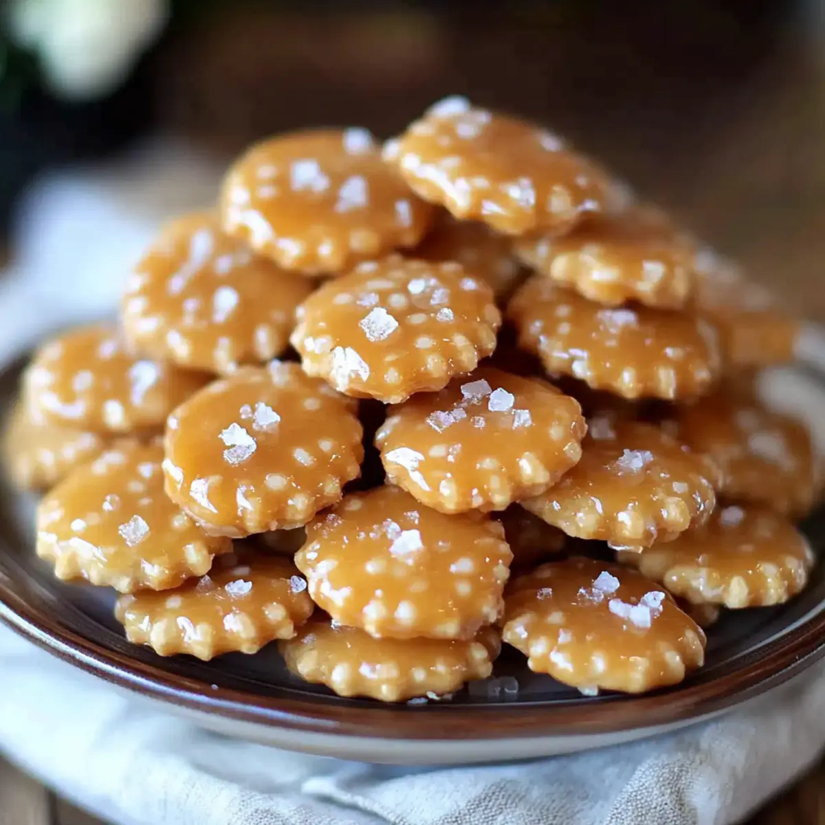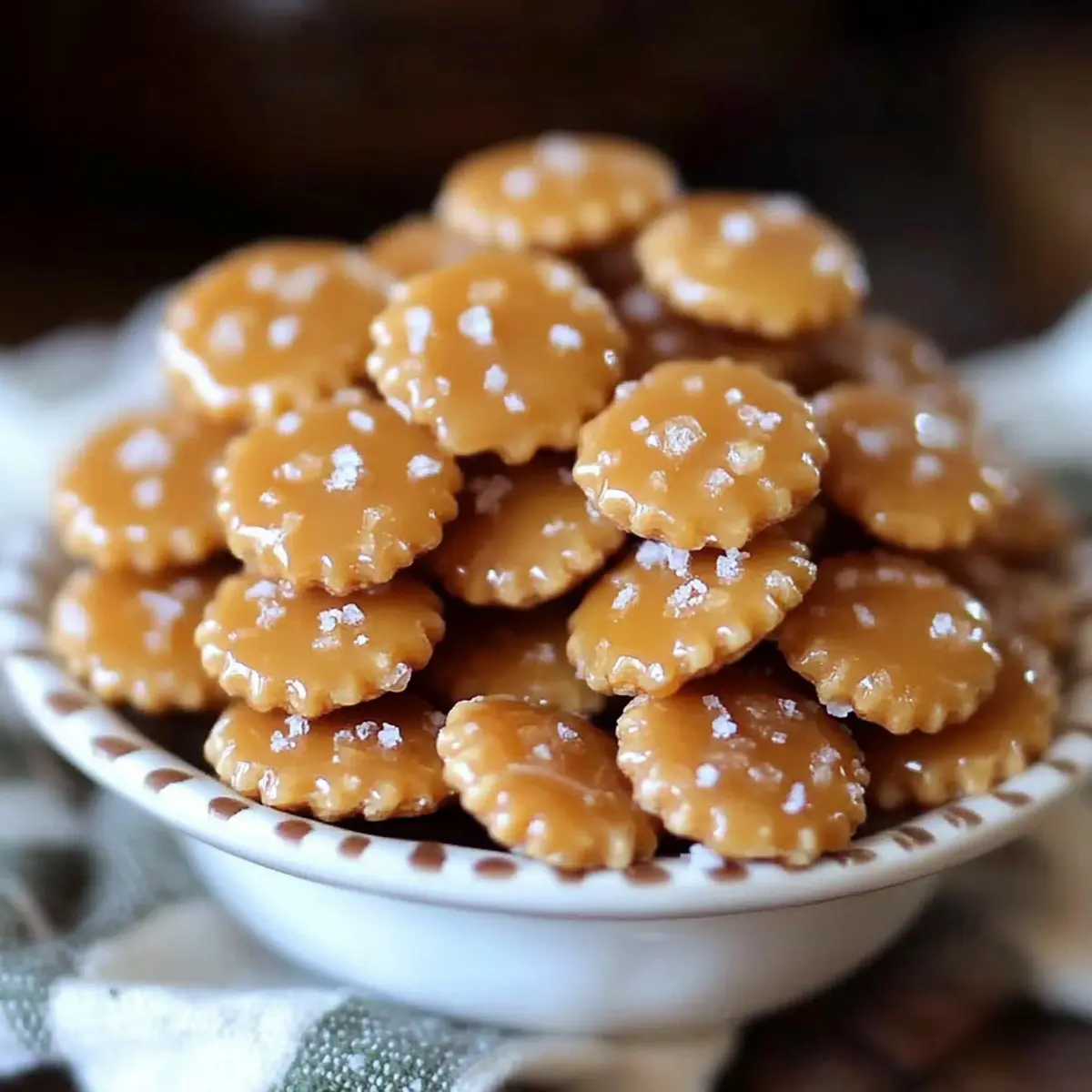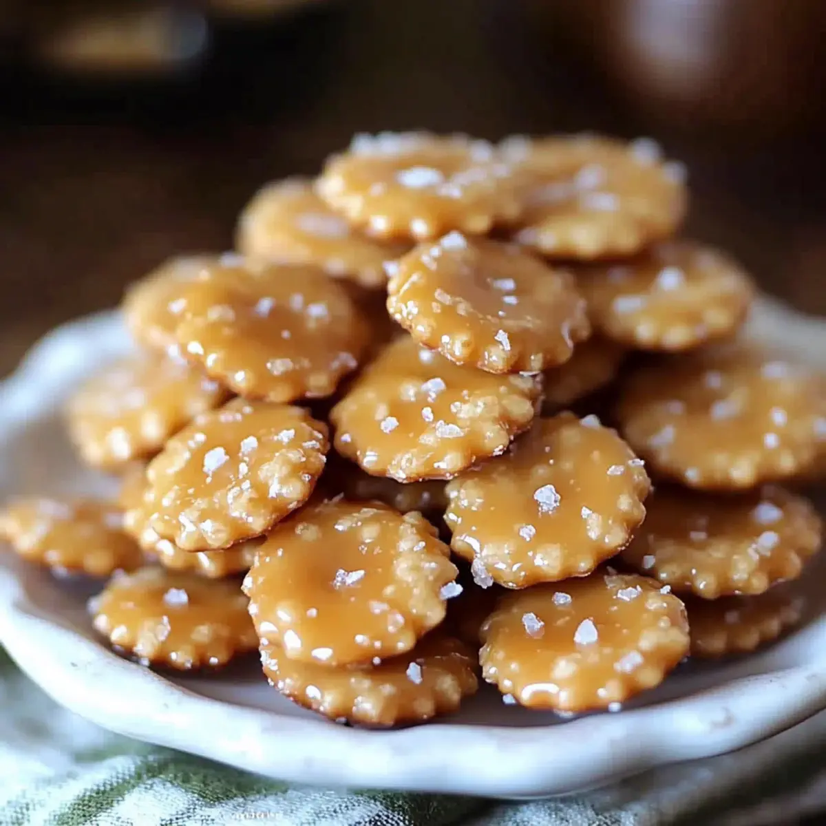 Jump to Recipe Print RecipeEvery now and then, I find myself in a snack dilemma—what to munch on during those late-night cravings that also feels a bit indulgent yet uncomplicated? That’s when these Salted Caramel Cracker Bites come to the rescue! In less than 30 minutes, you’ll have a crispy, sweet, and salty concoction that dances on your taste buds. With just a few pantry staples like buttery caramel, a dash of cinnamon, and a sprinkle of salt sitting atop crunchy oyster crackers, these bites are the perfect balance of flavors. Not only are they quick to whip up, but they also make for a crowd-pleasing treat at gatherings or cozy nights in. Curious how simple ingredients can transform into something sensational? Let’s dive into the recipe! Why Are They So Addictive? Irresistible Crunch: The crispy oyster crackers provide the perfect base, giving these bites a satisfying crunch that complements the caramel beautifully. Quick and Easy: With just under 30 minutes to prepare, you can whip up these treats whenever the craving strikes. Sweet and Salty Bliss: The delightful balance of sweet caramel and a sprinkle of salt creates a flavor profile that keeps you coming back for more. Crowd-Pleasing Snack: Whether for a party or a cozy movie night, these bites are sure to impress your guests and satisfy your family. Versatile Variations: Mix things up by swapping in different crackers or experimenting with toppings; try drizzling melted chocolate for an even more decadent treat! Don’t miss out on other delicious snacks like Salted Caramel Apple Parfaits or S’mores Bites that are just as easy and delightful! Salted Caramel Cracker Bites Ingredients • Here’s everything you need to make these irresistible treats! For the Bites Oyster crackers – These are the main base that provide a crunchy texture; feel free to swap for other small crackers if desired. Butter – Use unsalted to control the final saltiness and add creamy richness to the caramel. Brown sugar – The key sweetener that deepens the caramel flavor; white sugar can substitute but may alter the taste. Vanilla extract – Enhances flavor; vanilla bean paste or imitation vanilla can be alternatives. Cinnamon – Adds warmth and complexity; omit if you prefer a simpler taste. Salt – Essential for flavor balance, a sprinkle of salt enhances the sweetness beautifully; opt for sea or kosher salt for the best results. Step‑by‑Step Instructions for Salted Caramel Cracker Bites Step 1: Preheat and Prepare Begin by preheating your oven to 350°F (175°C). While the oven heats, line a baking sheet with parchment paper to prevent sticking. This simple preparation will ensure your Salted Caramel Cracker Bites bake evenly and come out easily, making cleanup a breeze. Step 2: Arrange the Crackers Spread the oyster crackers evenly across the prepared baking sheet in a single layer. This gives each cracker ample space to absorb the caramel once it’s poured on top. The crackers will form the delightful base of your Salted Caramel Cracker Bites, so make sure they are positioned closely together without overlapping. Step 3: Melt the Caramel Ingredients In a medium saucepan over medium heat, melt the unsalted butter completely. Once melted, add the brown sugar, vanilla extract, and cinnamon. Stir consistently until the sugar is dissolved and the mixture is smooth, ensuring that every element is well combined and ready for the next step in creating your sweet, buttery caramel. Step 4: Boil the Mixture Increase the heat slightly and bring the caramel mixture to a gentle boil. Allow it to boil for about 2-3 minutes, stirring constantly. You’ll know it’s ready when the mixture thickens a bit and bubbles confidently in the pan, turning into a delicious golden caramel that will coat your crackers beautifully. Step 5: Coat the Crackers Carefully pour the hot caramel over the oyster crackers, using a spatula to spread it evenly. Make sure each cracker is coated well, as this is what will give your Salted Caramel Cracker Bites their sweet, chewy texture. Follow this with a generous sprinkle of salt to enhance the flavors and create that perfect sweet and salty balance. Step 6: Bake to Perfection Place the baking sheet in your preheated oven and bake for 7-9 minutes. Keep a close eye during this time; the caramel should become bubbly and slightly darker without burning. The heavenly aroma will waft through your kitchen, hinting at the deliciousness that awaits. Step 7: Cool and Break Apart Once baked, remove the tray from the oven and let the Salted Caramel Cracker Bites cool on the baking sheet for about 10 minutes. Once cooled, gently break them apart into clusters. Allow them to cool completely at room temperature to ensure the caramel hardens perfectly and each bite retains its delightful crunch. What to Serve with Salted Caramel Cracker Bites Indulge in the delightful pairing possibilities that enhance the sweet and salty magic of these bites. Creamy Vanilla Ice Cream: The cool creaminess of vanilla ice cream perfectly balances the warm flavors of the bites, offering a luscious contrast. Fresh Berries: Juicy strawberries or tart raspberries add a fresh pop that complements the sweetness, brightening your snack experience. Nutty Trail Mix: A crunchy, nutty trail mix introduces a wholesome texture and flavor, making each bite even more irresistible. Chocolate Dipped Pretzels: Pairing salty pretzels with rich chocolate creates a delectable mix of sweet and salty, enhancing the overall flavor palette. Chai Latte: A warm chai latte’s spice harmonizes beautifully with the cinnamon notes in the bites, enveloping you in cozy comfort. Sparkling Apple Cider: The crisp fizz of sparkling apple cider elevates your snack time into a festive affair, refreshing your palate between bites. Consider these pairings as enhancements to an already magical treat, transforming any snack time into a delightful celebration! Make Ahead Options These Salted 