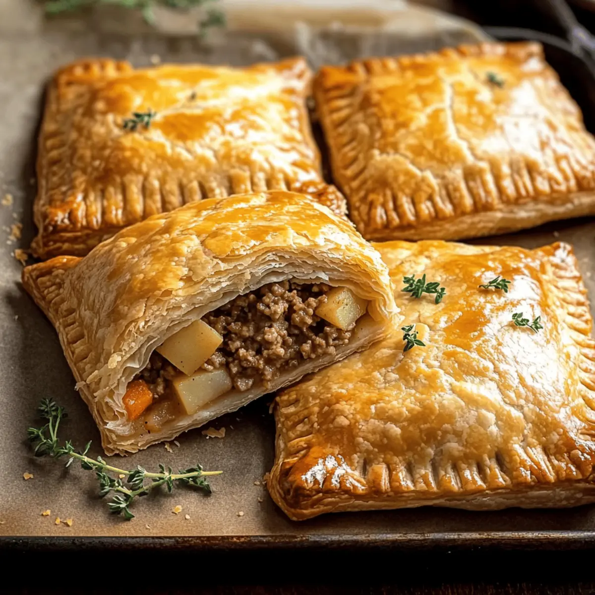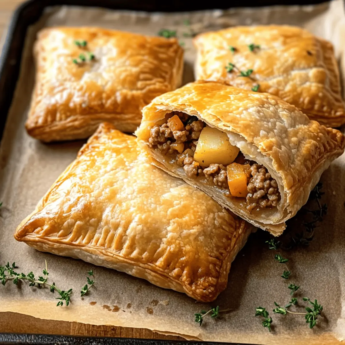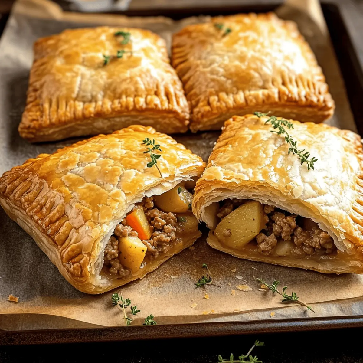 Jump to Recipe Print RecipeAs I unwrapped the crisp, golden exterior of my first savory hand pie, the irresistible aroma of hearty beef, fresh vegetables, and fragrant thyme enveloped me like a warm hug. These cozy Savory Hand Pies are not just a tasty treat; they’re the perfect portable meal for busy days or chilly evenings. With their flaky puff pastry and rich filling, they effortlessly combine comfort food with the ease of a semi-homemade dish, making them ideal for quick lunches or satisfying dinners. Best of all, these hand pies are completely customizable, letting you swap in your favorite proteins or veggies, and they’re freezer-friendly for busy weeks ahead. What delicious filling will you choose to make your hand pies uniquely yours? Why Are Savory Hand Pies Irresistible? Comforting, these hand pies wrap a hearty filling in a flaky, golden crust, making every bite a warm hug for your taste buds. Customizable to fit any mood, you can easily swap fillings with chicken or veggies, allowing endless tasty variations. Freezer-Friendly, you can prepare a batch ahead for quick meals any day of the week. Perfectly Portable, they’re ideal for on-the-go lunches or cozy dinners paired with a salad. Plus, if you enjoy delicious comfort food, you’ll want to check out my Savory Breakfast Muffins and Savory French Onion recipes for more delightful options! Savory Hand Pie Ingredients For the Filling • Ground Beef – The main protein that forms the hearty filling; try substituting with ground chicken or turkey for a lighter option. • Potatoes – Adds creaminess and texture; be sure to dice them into small pieces for even cooking. • Carrots – Builds sweetness and color; canned peas and carrots can be used for a quick alternative. • Onions – Provides foundational flavor; yellow or sweet onions work well for this filling. • Celery – Adds crunch and flavor; dice small to ensure it distributes evenly throughout the filling. • Peas – Introduces vibrant color and texture; feel free to omit or replace them with corn if desired. • Fresh Thyme – Enhances the filling with an aromatic herby note; dried thyme can be substituted (use less). For the Pastry • Puff Pastry – The flaky, golden exterior that encases the filling; opt for high-quality, all-butter puff pastry for the best flavor. • Egg Wash – Gives the pies a golden-brown finish; you may use milk for a dairy-free alternative. Step‑by‑Step Instructions for Savory Hand Pies Step 1: Brown the Beef Heat a large skillet over medium heat, then add the ground beef. Cook for about 5-7 minutes or until it’s browned and no longer pink, stirring occasionally to break it up. If there’s excess fat, carefully drain it from the skillet, preparing a clean base for the savory hand pies’ filling. Step 2: Add the Vegetables Once the beef is browned, toss in the diced potatoes, carrots, celery, onions, and fresh thyme. Cook everything together for 10-15 minutes, stirring occasionally, until the vegetables are tender and fragrant. This mixture will become the hearty filling for your cozy savory hand pies. Step 3: Final Touches to the Filling In the last few minutes of cooking, stir in the peas and season the mixture with salt and pepper to taste. Cook until the peas are heated through. Once done, remove the skillet from heat and let the filling cool down while you prep the puff pastry. Step 4: Preheat the Oven As the filling cools, preheat your oven to 400°F (200°C). This step is crucial for achieving that perfect golden-brown crust on your savory hand pies. Make sure your oven is fully heated to ensure even baking. Step 5: Prepare the Puff Pastry Roll out the chilled puff pastry on a lightly floured surface. Cut the pastry into squares of your desired size, great for enclosing the savory filling of your hand pies. Aim for a uniform size to ensure even baking and a beautiful presentation. Step 6: Fill the Pastry Squares Spoon a generous amount of the cooled filling onto the center of each pastry square, leaving space around the edges for sealing. This will ensure that each savory hand pie is packed with that delicious beef and veggie goodness. Step 7: Seal the Hand Pies Top each filled square with another pastry square, folding over carefully to encase the filling. Use your fingers or a fork to seal the edges securely, preventing any filling from leaking during baking. This step is vital to keep the savory goodness inside your hand pies. Step 8: Apply Egg Wash and Vent Beat an egg in a small bowl and brush the tops of the assembled savory hand pies with the egg wash; this gives them a beautiful glossy finish. Then, make a few small slits on top to allow steam to escape, preventing sogginess during baking. Step 9: Bake to Perfection Place the savory hand pies on a baking sheet lined with parchment paper. Bake in the preheated oven for 24-26 minutes or until they are puffed and golden brown. Keep an eye on them towards the end, as a beautifully flaky crust is the goal. Expert Tips for Savory Hand Pies • Chill Your Dough: Ensure your puff pastry is cold when working with it; this will help achieve that flaky, scrumptious crust when baked. • Avoid Overfilling: Don’t overstuff your savory hand pies; a heaping spoonful of filling is perfect. If it’s too much, they might burst during baking! • Cooling Time: Always let your filling cool before spooning it onto the pastry. This step prevents steam from making your pastry soggy. • Sealing Technique: Use a fork to crimp the edges firmly, ensuring they seal well. This helps keep all the hearty goodness inside your savory hand pies. • Preparing for Freezing: For optimal results, par-freeze the assembled pies before transferring to a bag. This keeps them intact for easy storage! • Flavor Variations: Experiment with spices or herbs in your filling to find your personal twist. A touch of paprika or garlic can elevate your savory hand pies beautifully. What to Serve wi