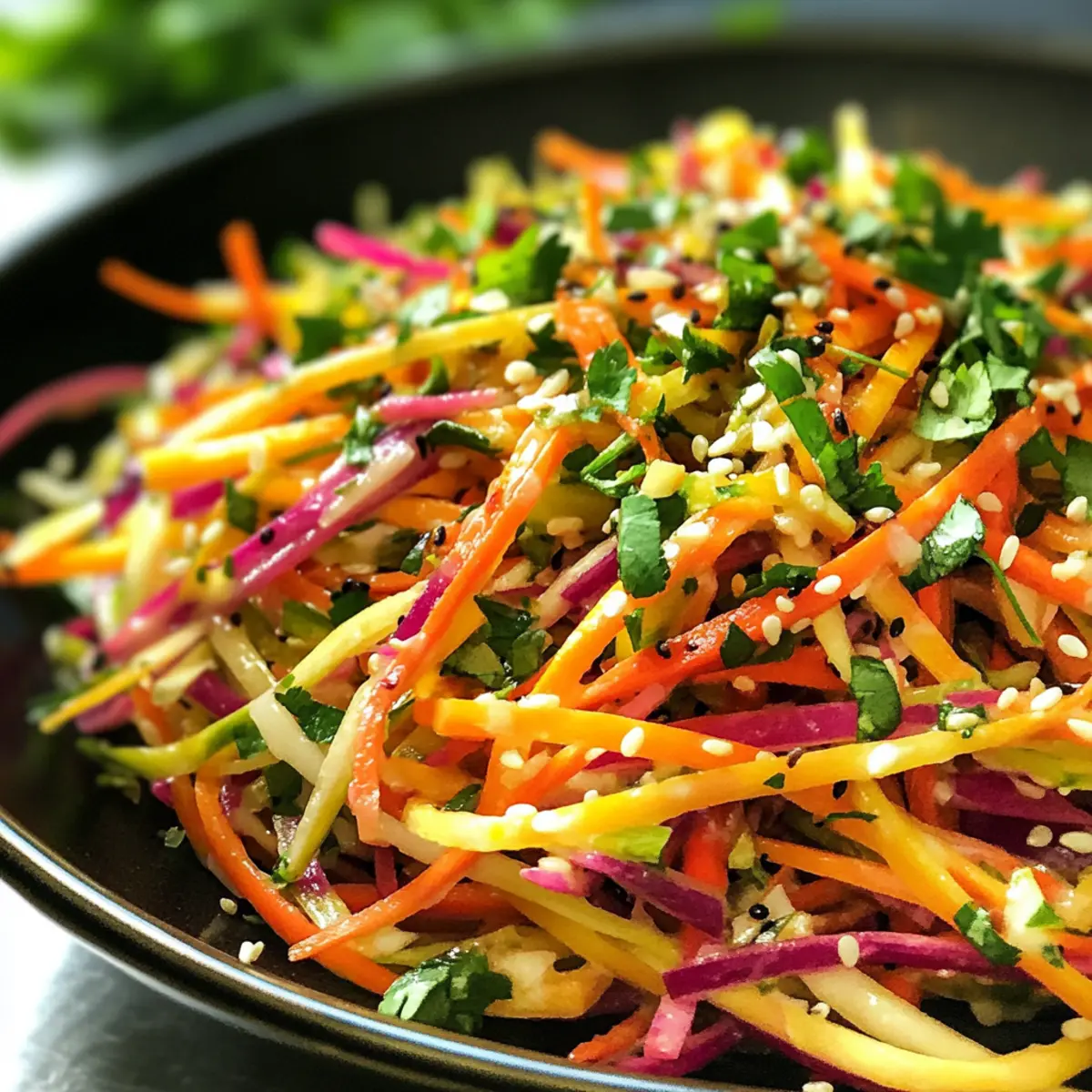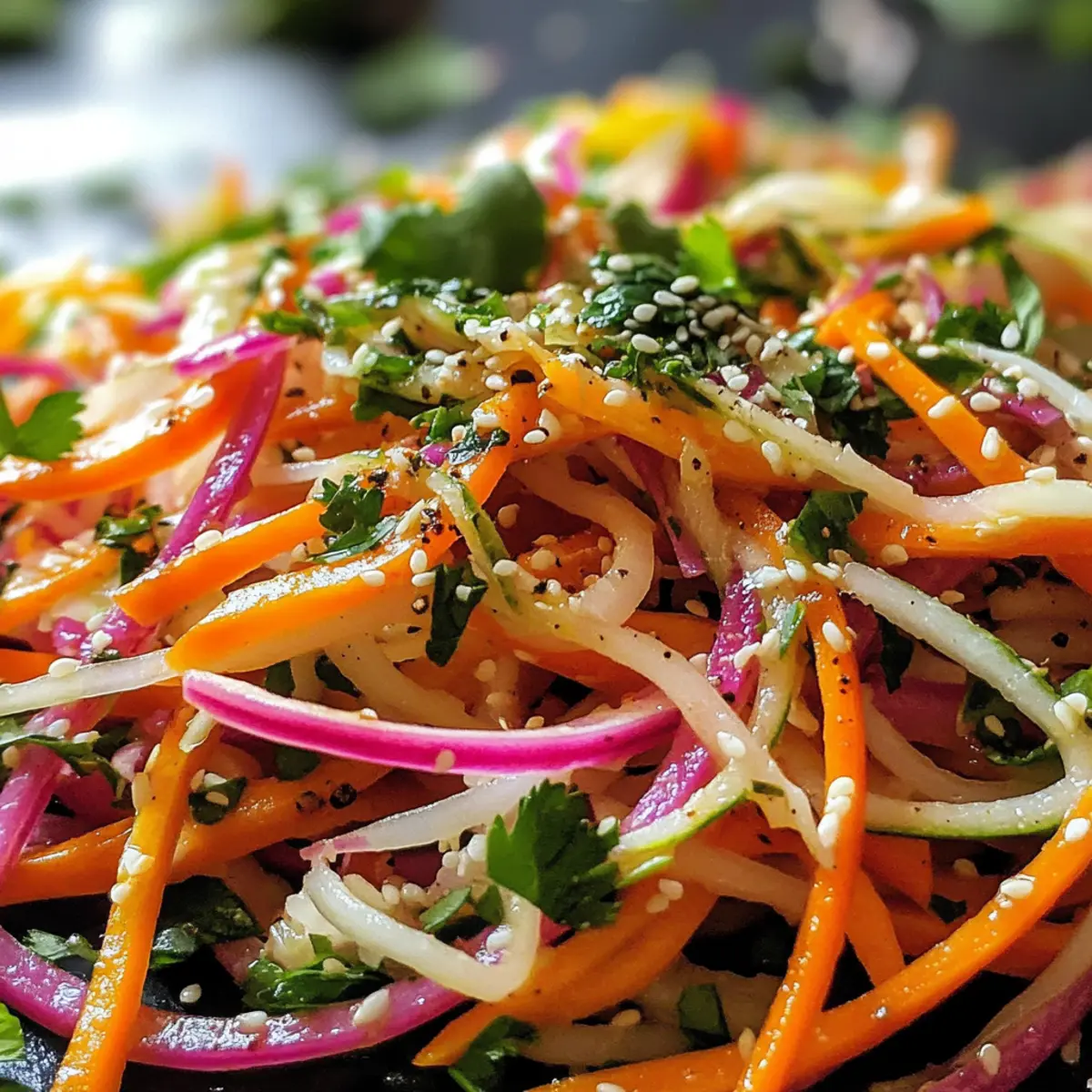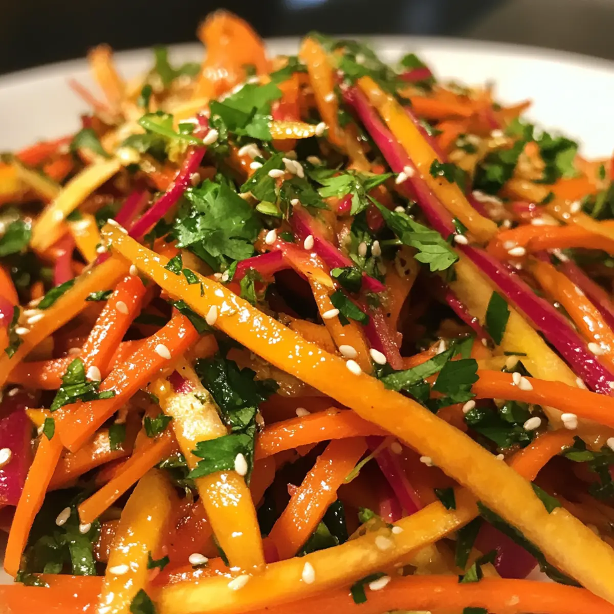 Jump to Recipe Print RecipeAs I was stirring up some healthy meal ideas, a burst of color caught my eye—fresh, vibrant carrots lined up like a rainbow on my kitchen counter. That’s when I decided to create this delectable Shaved Rainbow Carrot Sesame Salad, showcasing their crunchy goodness and zesty flair. With a mere 20 minutes of prep time, this quick and nutritious salad is not only a feast for the eyes but also packs a powerful punch of vitamins and healthy fats. Whether served alongside a grilled entrée or enjoyed solo as a refreshing snack, this salad is bound to become a staple in your kitchen. Are you ready to transform your table into a colorful celebration of flavor? Why is this salad a must-try? Vibrant, eye-catching colors: This Shaved Rainbow Carrot Sesame Salad is a feast for the eyes, turning any meal into a visually stunning experience. Quick and easy preparation: With just 20 minutes to whip this up, you can easily fit it into a busy schedule. Nutrient-dense delight: Packed with vitamins and healthy fats, it’s perfect for those seeking light, nutritious options. Versatile serving: Enjoy it alone as a light snack or pair with grilled chicken from our Thai Chicken Salad for a complete meal. Unique flavor profile: The combination of zesty sesame dressing and fresh herbs creates an irresistible taste sensation. Shaved Rainbow Carrot Sesame Salad Ingredients For the Salad Rainbow Carrots – Freshness and crunch; substitute with regular carrots if rainbow is unavailable. Scallions – Adds mild onion flavor; can replace with chives for a subtler taste. Cilantro – Provides herbal freshness; substitute with parsley if desired. Basil – Adds aromatic depth; other herbs like mint can be used for a tasty variation. For the Dressing Sesame Oil – Adds depth and nuttiness; can replace with olive oil for a lighter flavor. Rice Vinegar – Provides acidity; substitute with apple cider vinegar if necessary. Tamari or Soy Sauce – Brings umami; use tamari for a gluten-free option. White Miso – Enhances flavor depth; can omit for a lighter dressing but may lose complexity. Sriracha – Adds heat; adjust based on spice tolerance or substitute with red pepper flakes. Coconut Sugar – Gives a hint of sweetness; brown sugar can be a direct substitute. Minced Garlic – Adds aromatic layers; use pre-minced options if short on time. Grated Ginger – Introduces warmth; swap with ground ginger if that’s what you have on hand. Sesame Seeds – For rich flavor and crunch; can use sunflower seeds for a nut-free option. This Shaved Rainbow Carrot Sesame Salad is easy to make and a sure winner at any table! Step‑by‑Step Instructions for Shaved Rainbow Carrot Sesame Salad Step 1: Toast the Sesame Seeds In a small dry pan over medium heat, add 1.5 tablespoons of sesame seeds. Stir constantly for about 5-7 minutes, or until they become golden brown and fragrant. Watch closely to avoid burning, as these seeds can quickly turn from perfect to overdone. Once toasted, remove them from the heat and set aside to cool. Step 2: Prepare the Carrots Take your fresh rainbow carrots and rinse them thoroughly under cool water. Next, using a vegetable peeler, peel the carrots to remove their outer skin. After peeling, julienne the carrots using a sharp knife or a mandoline slicer for even, thin shavings. Place the beautifully shaved carrots in a large mixing bowl, creating a vibrant base for your Shaved Rainbow Carrot Sesame Salad. Step 3: Combine Fresh Ingredients Chop the scallions, cilantro, and basil into small pieces, ensuring their fresh flavors will shine through in the salad. Add these aromatic herbs to the bowl with the julienned carrots. Toss the mixture gently using your hands or salad tongs, making sure everything is evenly distributed and well-blended, creating an eye-catching medley of colors and freshness. Step 4: Make the Dressing In a blender, combine the dressing ingredients: rice vinegar, sesame oil, Tamari or soy sauce, white miso, sriracha, coconut sugar, minced garlic, and grated ginger. Blend on high until the mixture is smooth and creamy, about 30 seconds to 1 minute. The dressing should have a balanced flavor profile, rich in umami with a hint of sweetness and spice, ready to elevate your Shaved Rainbow Carrot Sesame Salad. Step 5: Dress the Salad Carefully pour the prepared dressing over the carrot and herb mixture in the mixing bowl. Using salad tongs, toss everything together gently but thoroughly to ensure every carrot strand is coated with the flavorful dressing. This will not only enhance the taste but also help the colors pop, making your salad irresistible. Step 6: Chill & Serve For optimal flavor, allow the salad to chill in the refrigerator for at least one hour before serving. This resting period will help the ingredients meld and enhance their flavors. When ready to serve, garnish your Shaved Rainbow Carrot Sesame Salad with the reserved toasted sesame seeds, adding a wonderful crunch and visual appeal to this vibrant dish. Storage Tips for Shaved Rainbow Carrot Sesame Salad Fridge: Store the dressed Shaved Rainbow Carrot Sesame Salad in an airtight container, where it will stay fresh for up to 3 days. Keep it chilled to maintain flavor and texture. Keep Dressing Separate: If you plan on keeping leftovers, store the sesame dressing separately and mix it with the salad just before serving. This will help preserve the crispness of the carrots. Avoid Freezing: Freezing is not advisable, as it will compromise the texture of the carrots when thawed. This vibrant salad is best enjoyed fresh! Make Ahead Options These vibrant Shaved Rainbow Carrot Sesame Salads are perfect for busy home cooks looking to save time during the week! You can wash, peel, and julienne the carrots up to 24 hours in advance, storing them in an airtight container in the refrigerator to maintain their crispness. Additionally, you can prepare the dressing in advance (up to 3 days) and keep it 