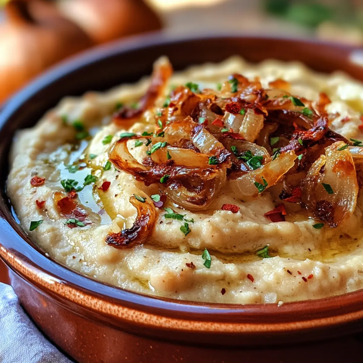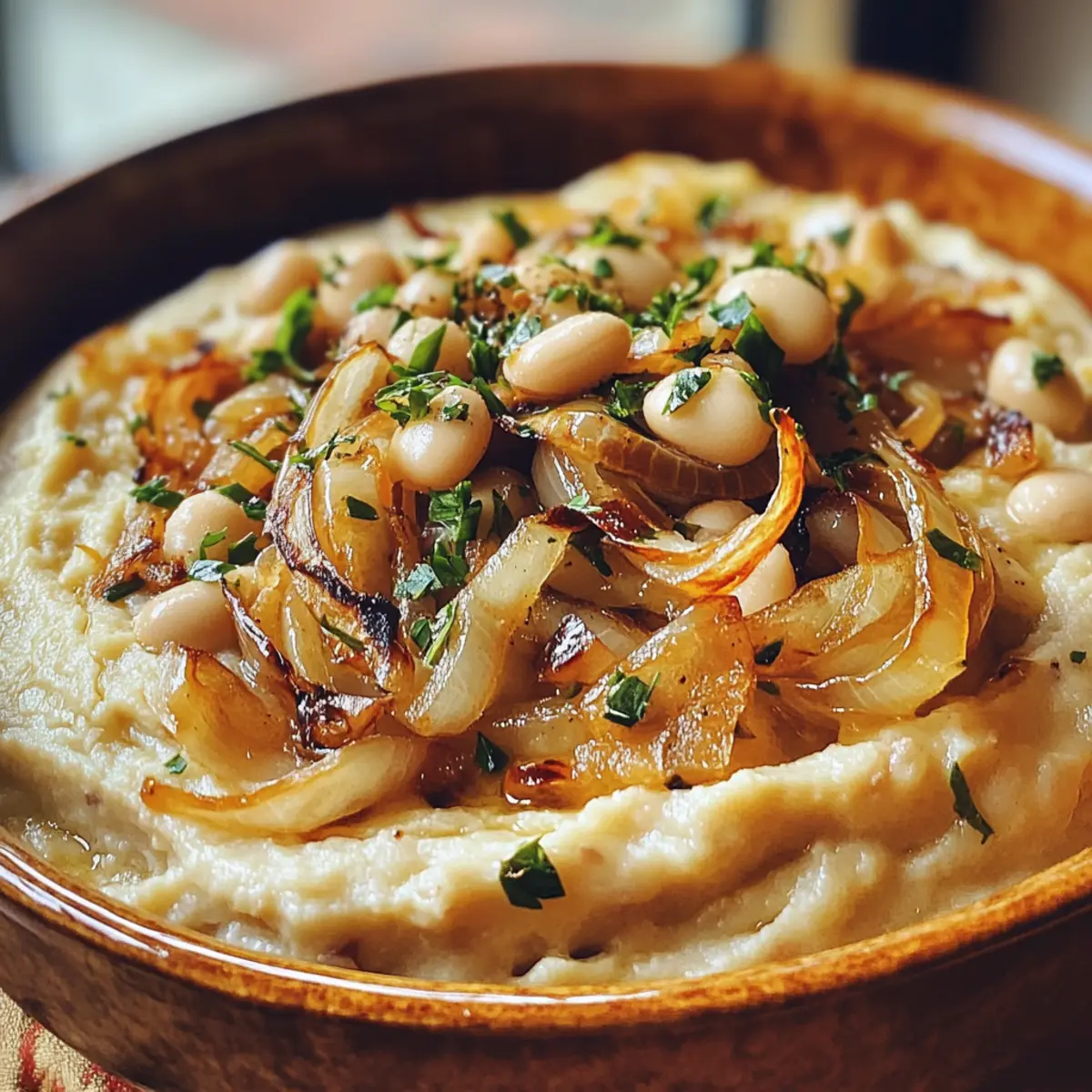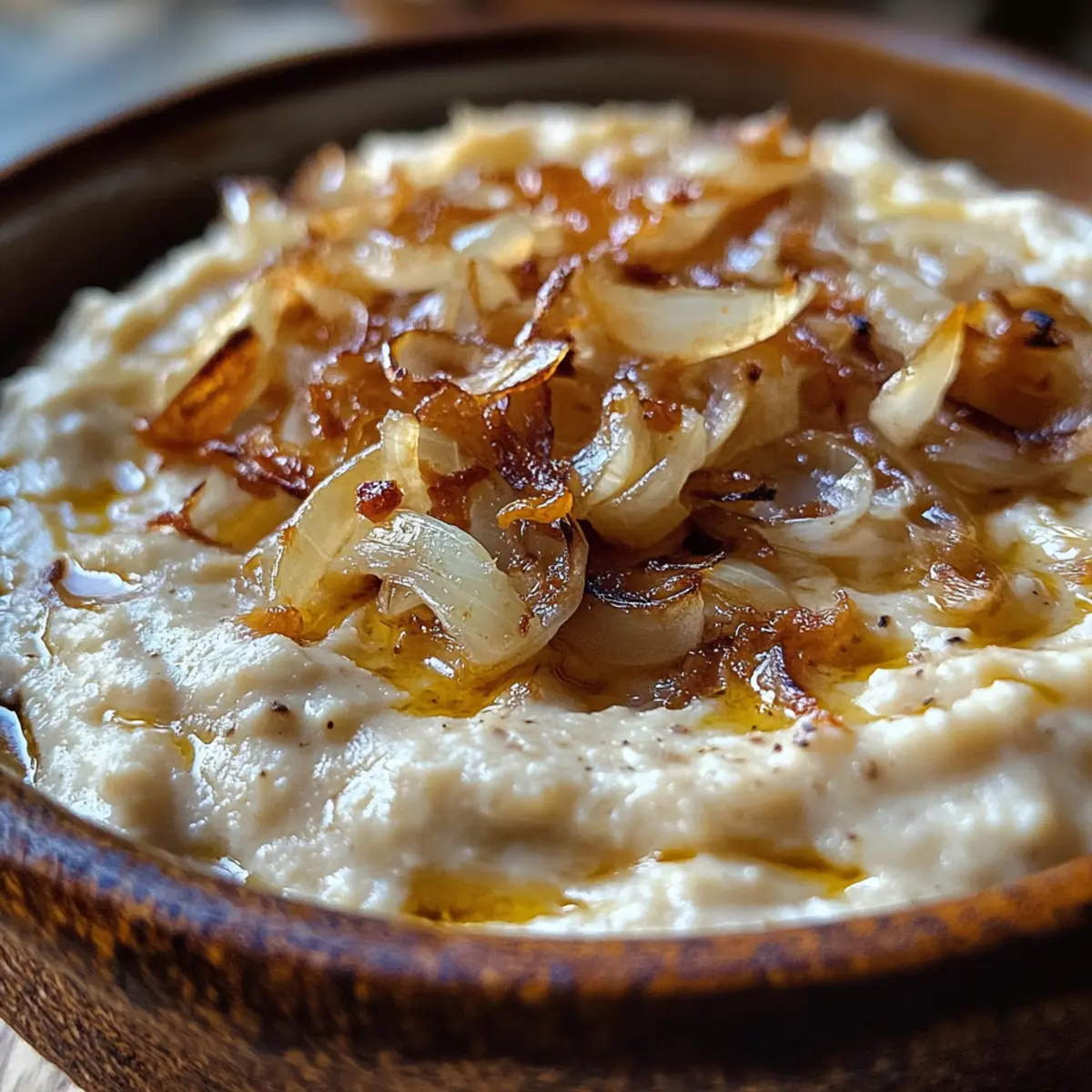 Jump to Recipe Print RecipeAs I walked into my kitchen, the sweet aroma of caramelized onions danced around me, instantly evoking memories of cozy family gatherings filled with laughter and good food. This Silky Romanian White Bean Dip with Caramelized Onions Delight is not just a recipe; it’s a comforting embrace in dip form! With its creamy texture and smoky hints of paprika, it bridges tradition and modern dietary needs, making it an ideal plant-based and gluten-free option. Whether you’re hosting friends for game night or simply treating yourself after a long day, this quick and easy recipe offers the perfect balance of indulgence and health. Ready to dip into something truly special? Let’s get cooking! Why is This Dip So Irresistible? Simplicity: This recipe comes together in no time, making it perfect for those busy weekdays or unexpected guests. Creamy Texture: The white beans create a silky base that pairs deliciously with the sweet, caramelized onions on top. Bold Flavor: Infused with smoky paprika and garlic, every bite bursts with rich, savory notes that will have everyone coming back for more. Versatile Serve: Whether spread on crusty bread or served with fresh veggie sticks, it’s adaptable for any occasion. Crowd-Pleaser: It’s a hit during gatherings or quiet nights at home, satisfying both plant-based eaters and traditional food lovers alike. You might also love pairing it with other delightful dishes like Thai Chicken Dressing or a refreshing Tomato Herby Bean. Silky Romanian White Bean Dip Ingredients • Get ready to create something special with these essential ingredients! For the Dip Canned White Beans – creamy base for the dip; cannellini or great northern beans work best for a smooth texture. Bean Canning Liquid – adds moisture for blending; don’t skip this step for optimal consistency. Garlic – infuses sharpness and depth; adjust the quantity according to your taste preference. Smoked Paprika – adds a rich, earthy tone; this key ingredient enhances the overall flavor. Salt – essential for balancing flavors; use wisely between the dip and the caramelized onions. For the Caramelized Onions Yellow Onions – contributes sweetness that caramelizes beautifully, creating a delightful contrast. Tomato Paste – brings tanginess and depth to the caramelized onions, enhancing the flavor profile. Sunflower Oil – allows for gentle cooking of the onions to prevent sticking and burning. With these simple yet impactful ingredients, you’re on your way to making a delightful Silky Romanian White Bean Dip with Caramelized Onions! Step‑by‑Step Instructions for Silky Romanian White Bean Dip with Caramelized Onions Delight Step 1: Prep Beans Start by draining the canned white beans and reserving 1/4 cup of the canning liquid. Rinse the beans under cold water in a colander to remove excess sodium and enhance flavor. This step ensures the dip’s base is creamy and smooth, creating a delightful texture for your Silky Romanian White Bean Dip with Caramelized Onions. Step 2: Blend Dip In a food processor, combine the drained beans, reserved canning liquid, half of the salt, and peeled garlic cloves. Blend everything until you achieve a silky and smooth consistency, usually about 1-2 minutes. Scrape down the sides as needed to incorporate all ingredients evenly, ensuring your dip is richly flavored and ready for the next steps. Step 3: Caramelize Onions Slice the yellow onions thinly and heat a non-stick skillet over low heat. Add sunflower oil, the remaining salt, and tomato paste, stirring to combine. Once hot, add the onions, ensuring they are coated in the oil and tomato paste mixture. Cook for about 10 minutes, stirring occasionally, until the onions become soft and translucent. Step 4: Finish Onions After the onions are softened, sprinkle in the smoked paprika and continue cooking on low heat. Stir frequently for an additional 8-10 minutes or until the onions turn a lovely golden brown and possess a sweet, caramelized flavor. This step is essential for enhancing the rich taste of your Silky Romanian White Bean Dip with Caramelized Onions delight. Step 5: Serve Once the onions reach the desired caramelization, it’s time to assemble! Spread the creamy bean mixture in a shallow serving dish, ensuring an even layer. Top generously with the sweet, caramelized onions, allowing their rich flavor to shine through. Get ready to share this delightful dip with friends or savor it on a cozy night in! Expert Tips for Silky Romanian White Bean Dip Blending Smoothly: Ensure you blend the white beans thoroughly for a silky texture; under-blending can lead to a grainy dip. Onion Care: Monitor the onions closely while caramelizing to prevent burning; low heat and frequent stirring are key for achieving their sweet flavor. Custom Garlic: Adjust the amount of garlic according to your taste; start with less and gradually increase to find your perfect balance in the Silky Romanian White Bean Dip with Caramelized Onions. Season Smartly: Distribute your salt wisely; adding it at different stages enhances the flavors of both the dip and the caramelized onions. Serving Ideas: Experiment with different dipping options like bread, crackers, or fresh veggies to find your favorite combo! How to Store and Freeze Silky Romanian White Bean Dip with Caramelized Onions Fridge: Store any leftover dip in an airtight container in the refrigerator for up to 4 days. This helps maintain its creamy texture and flavor. Freezer: If you want to keep it longer, freeze the dip in an airtight container for up to 3 months. Thaw overnight in the fridge before using. Reheating: To enjoy the dip warm, microwave it gently in short bursts, stirring in between, until heated through. Avoid high heat to preserve the consistency. Serving Tip: Before serving, stir well after thawing or reheating to restore the dip’s silky texture. Enjoy the delightful flavors of your Silky Romanian White Bean Dip with Carame