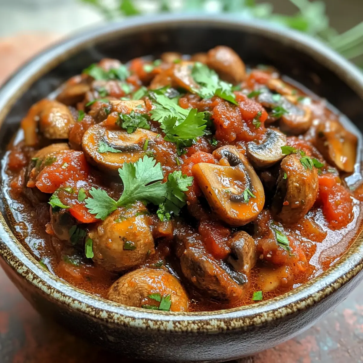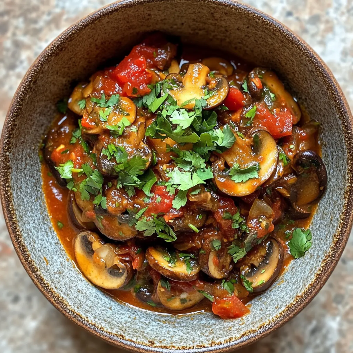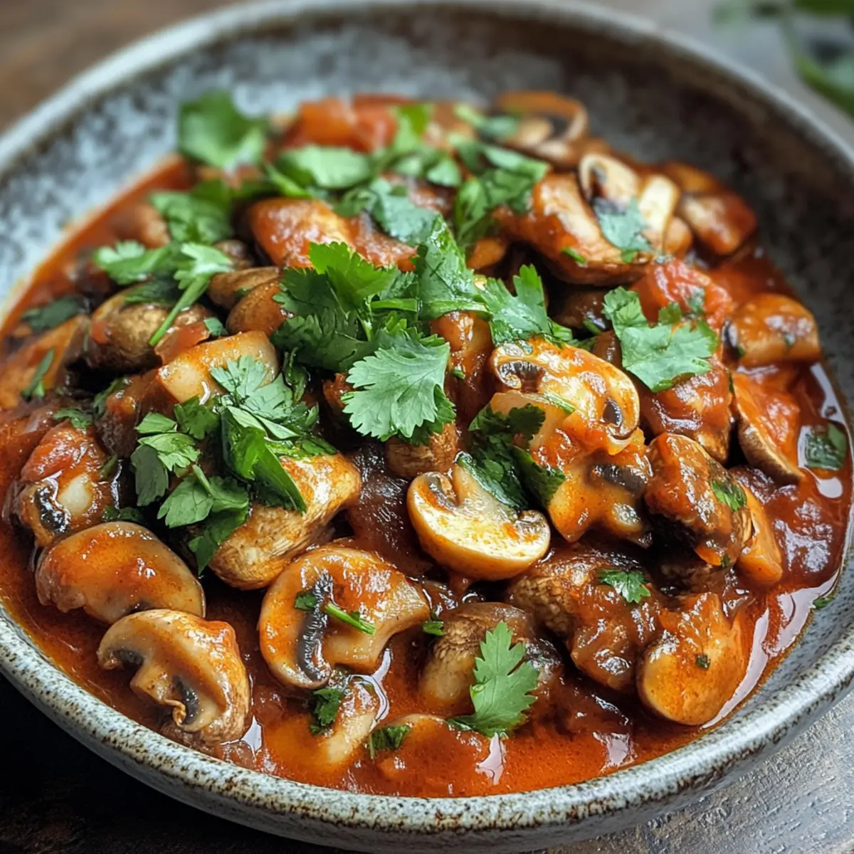 Jump to Recipe Print RecipeAs I sat in my kitchen, the aroma of sizzling mushrooms filled the air, transporting me to the vibrant streets of Tbilisi. The moment I decided to whip up a pot of Spicy Georgian Mushroom Stew, or Chashushuli, I knew dinner was going to be anything but ordinary. This hearty vegan dish is not only a delightful twist on traditional Georgian fare, but it’s also a quick-cooking miracle, taking just about 45 minutes to hit the table. With bold flavors and a perfect spicy kick, it promises to please everyone, from seasoned chefs to those simply craving a comforting, home-cooked meal. So, are you ready to warm up your kitchen and indulge in a taste of Georgia like never before? Why is this stew a must-try? Hearty and Satisfying: With its rich tomato base and perfectly cooked mushrooms, this stew warms not just your stomach but your soul. Quick and Easy: In just 45 minutes, you can serve a flavorful meal that’s as convenient as it is delicious. Versatile Variations: Whether you go for the vegan version or opt to add beef, there’s a perfect twist for everyone’s taste. Bold Flavors: The combination of spices and fresh herbs, especially adjika, delivers a unique and adventurous flavor profile that’s sure to impress. Crowd-Pleaser: This dish is not only filling but can easily satisfy pickiest of eaters, just like my favorite Vegan Lebanese Stew. Prepare to indulge in a delightful culinary journey that’s both comforting and uniquely Georgian! Spicy Georgian Mushroom Stew Ingredients For the Stew Button Mushrooms – Quarter them for a hearty base that adds texture. Yellow Onion – Diced finely to bring a sweet-savory depth. Fresh Cilantro – Reserve the leaves for garnish; the stems add intensity to the flavor. Green Chili – Adjust to your taste for the desired heat level. Garlic – Minced for quick and even distribution of aroma. Adjika – This spicy Georgian paste adds depth; substitute with chili flakes if you can’t find it. Tomato Paste – Incorporate for a rich and flavorful body to the stew. Dried Savory – A perfect herbal complement; thyme can be used as a substitute. Canned Whole Tomatoes – Crush by hand for rustic texture; they serve as the stew’s juicy base. Bay Leaves – Enhance the stew with aromatic depth during cooking. Serving Suggestions Crusty Bread – A necessity to soak up all those delicious flavors. Rice or Mashed Potatoes – Serve it over these for a comforting meal experience. Elevate your dinner with this Spicy Georgian Mushroom Stew that promises to warm your heart and tantalize your taste buds! Step‑by‑Step Instructions for Spicy Georgian Mushroom Stew Step 1: Sauté the Mushrooms Heat a generous drizzle of neutral oil in a large saucepan over medium heat. Once the oil is shimmering, add the quartered button mushrooms. Sauté for about 5–10 minutes, stirring occasionally, until the mushrooms are browned and have significantly reduced in size. The mushrooms should be golden and fragrant, creating a savory base for your Spicy Georgian Mushroom Stew. Once done, remove them from the pot and set aside. Step 2: Cook the Aromatics In the same pot, add additional oil if necessary, then toss in the finely diced yellow onions along with the chopped cilantro stems and minced green chili. Sauté these for about 5 minutes until the onions turn translucent and soft. As the mix cooks, the rich aroma will fill your kitchen, creating a flavorful foundation for your stew. Step 3: Add Garlic and Spices Next, stir in the minced garlic, adjika, tomato paste, and dried savory. Continue to cook for about 30 seconds to 1 minute, allowing the spices to blossom and the garlic to become fragrant. This mixture will deepen the flavors of your Spicy Georgian Mushroom Stew, making it even more aromatic and delicious. Step 4: Combine Mushrooms and Vegetables Return the sautéed mushrooms to the pot, mixing them well with the onion and spice mixture. Make sure each piece of mushroom is coated with the flavorful blend, enhancing the overall taste of your stew. This step helps to marry the flavors together beautifully as they cook. Step 5: Incorporate Tomatoes and Water Pour in the crushed canned tomatoes along with enough water to reach your desired stew consistency. Add the bay leaves for a touch of aromatic depth. Mix everything together, and bring the mixture to a robust boil, allowing the flavors to meld beautifully in your Spicy Georgian Mushroom Stew. Step 6: Simmer to Thicken Once boiling, reduce the heat to low and let the stew simmer uncovered for about 30 minutes. This slow cooking will thicken the sauce while melding all of the flavors into a comforting, hearty brew. Stir occasionally, watching the stew transform into a rich and savory masterpiece. Step 7: Finish with Fresh Herbs After 30 minutes, stir in the chopped cilantro leaves for a fresh burst of flavor just before serving. This final touch will add brightness and enhance the overall taste of the Spicy Georgian Mushroom Stew. Once the cilantro is evenly distributed, your stew is ready to be plated and enjoyed! Spicy Georgian Mushroom Stew Variations Feel free to get creative with this vibrant stew, enhancing its flavors and textures to suit your preferences! Mushroom Varieties: Try using shiitake or portobello mushrooms for a deep, umami flavor that elevates the stew. Protein Additions: Swap mushrooms for beef or chicken in traditional versions, or even chickpeas for a protein-packed vegan twist. Heat Levels: Adjust spiciness by adding more green chilies or a sprinkle of cayenne pepper for those who love a fiery kick. Herb Infusion: Add a handful of fresh parsley or dill along with cilantro for an aromatic flavor boost, enriching every bite. Smoky Flavor: Incorporate smoked paprika into the spice blend for a warm, smoky undertone that complements the stew beautifully. Creamy Texture: Blend in a bit of coconut milk just before serving for added creaminess without losing the vegan
