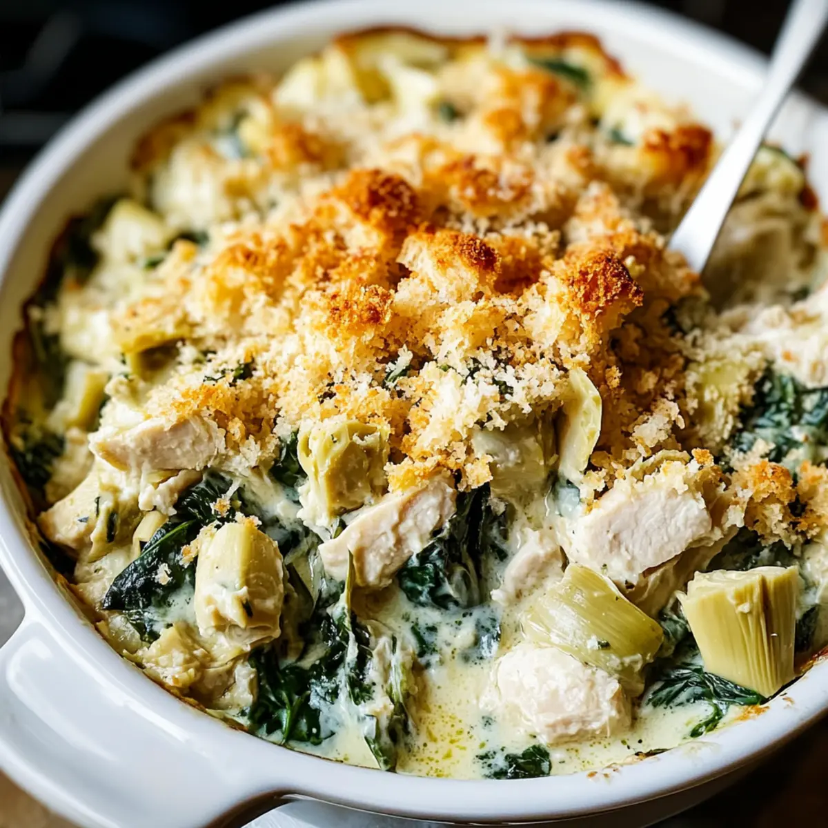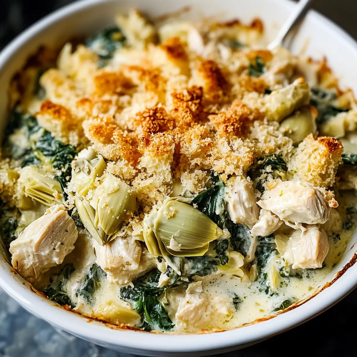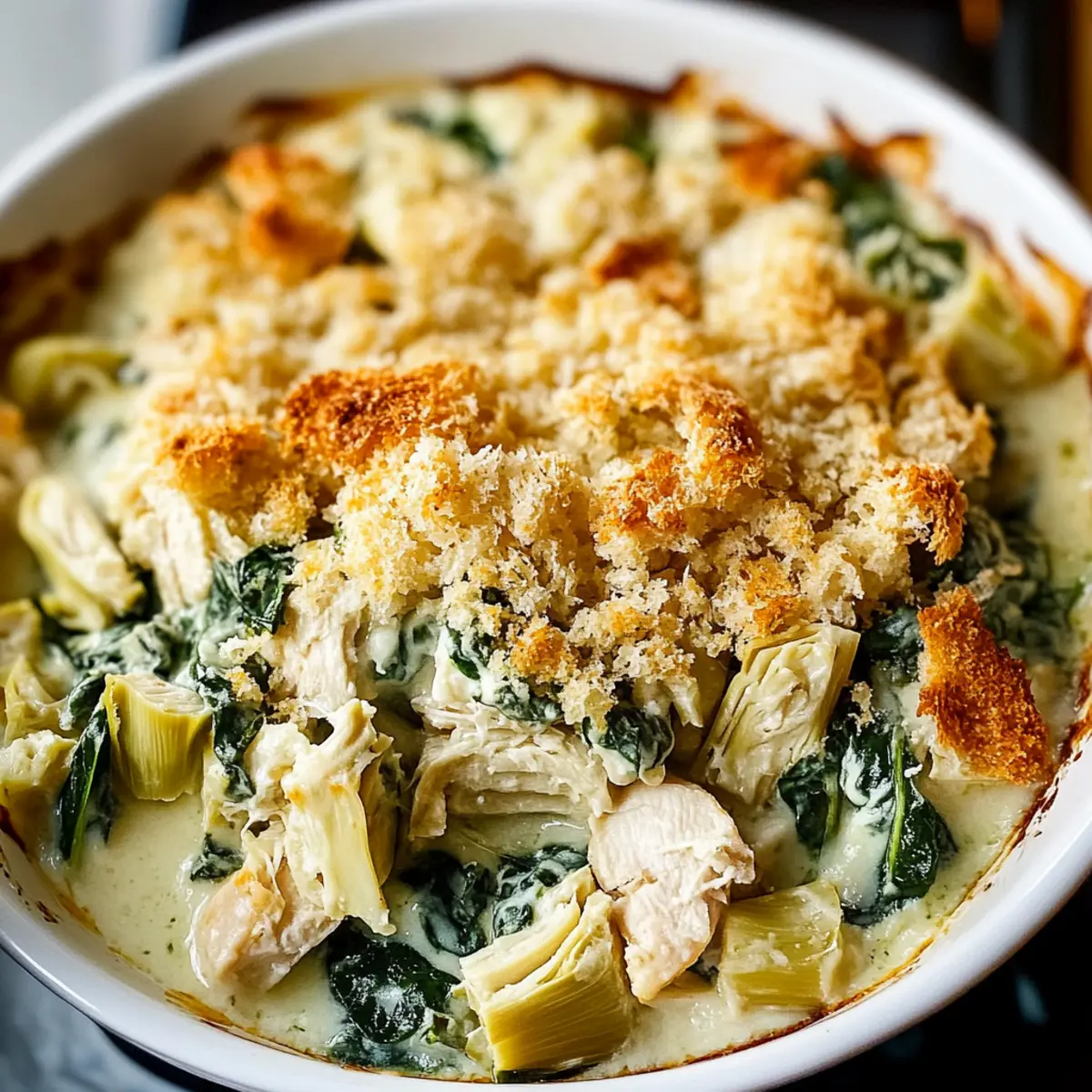 Jump to Recipe Print RecipeAs I opened my fridge searching for inspiration, a half-eaten jar of artichoke hearts caught my eye. That moment sparked the creation of my Spinach and Artichoke Chicken Casserole, a dish that elegantly balances comfort food and convenience. With tender chicken shimmering beneath layers of creamy spinach and tangy artichokes, this cheesy bake is the answer to your busy weeknight meals. In under an hour, you can create a heartwarming feast that will have everyone requesting seconds. Not only is it easy to whip up, but it also embraces those rich, nostalgic flavors we all crave. Whether you’re gathering friends for a cozy dinner or aiming to impress with a dish at your next potluck, this casserole has you covered. Curious how a simple combination can become a family favorite? Let’s dive into the recipe! Why is this casserole a must-try? Comforting, Hearty Dish: This Spinach and Artichoke Chicken Casserole is the ultimate comfort food, combining rich flavors with nutritious ingredients that satisfy cravings. Quick Preparation: Perfect for busy weeknights, this dish comes together in under an hour, making it a hassle-free dinner option for everyone. Crowd-Pleasing Flavor: With its creamy, cheesy goodness, this casserole will have family and friends asking for seconds, whether served at a cozy dinner or festive potluck. Versatile Ingredients: Feel free to swap the cooked chicken for chickpeas for a vegetarian twist, or add other veggies for a personalized touch! Easy Leftover Storage: Leftovers last for several days, allowing you to enjoy this delicious dish even on busy days ahead. Serve it alongside a fresh salad for a perfectly balanced meal and experience comfort food like never before! If you love hearty home cooking, check out my Cheddar Spinach Chicken for another delightful option! Spinach and Artichoke Chicken Casserole Ingredients For the Casserole • Cooked Chicken – Opt for shredded or diced; leftover rotisserie chicken adds extra flavor. • Artichoke Hearts – These bring an earthy flavor; you can substitute with fresh if you prefer a more vibrant taste. • Frozen Chopped Spinach – This ingredient adds moisture and nutrients; feel free to use fresh spinach that has been sautéed and drained. • Mayonnaise – Offers richness to the sauce; try Greek yogurt for a lighter alternative. • Sour Cream – Adds tanginess while lightening the dish; Greek yogurt works here as well. • Mozzarella Cheese – Provides that gooey, melty texture; switch to cheddar for a bolder flavor. • Parmesan Cheese – Delivers a savory kick; Pecorino Romano makes a fantastic substitute. • Garlic Powder – Infuses the dish with aromatic warmth; fresh garlic can be used but take care not to burn it. • Onion Powder – Adds depth to the flavor; you can use fresh sautéed onions for a fresher bite. • Black Pepper – Adds gentle heat and enhances overall flavors; white pepper can be used for a milder effect. • Salt – Elevates all the flavors harmoniously. • Olive Oil – Essential for greasing the baking dish; also adds a subtle flavor profile. • Breadcrumbs – Creates a crunchy topping; Panko adds a lighter texture, which can be seasoned if desired. • Butter – Helps the breadcrumbs crisp up beautifully while contributing richness. For the Topping • Breadcrumbs – Use Panko for a lighter, airier texture; season them for added flavor. • Butter – Aids in achieving that perfect golden-brown crust over your casserole. With these Spinach and Artichoke Chicken Casserole ingredients, you’re on your way to creating a dish that’s not only comforting but also bursting with flavor. Happy cooking! Step‑by‑Step Instructions for Spinach and Artichoke Chicken Casserole Step 1: Preheat the Oven Begin by preheating your oven to 375°F (190°C). This ensures your Spinach and Artichoke Chicken Casserole cooks evenly, developing a golden crust on top. While the oven is warming up, gather all your ingredients and the necessary baking dish, making your cooking process smoother and more enjoyable. Step 2: Prepare the Filling In a large mixing bowl, combine your cooked chicken, artichoke hearts, and thawed spinach. Use a fork to break up the spinach and mix thoroughly for an evenly distributed filling. The mixture should look vibrant and well-blended, ready to be transformed into a comforting casserole. Step 3: Add Creamy Ingredients Next, stir in the mayonnaise, sour cream, mozzarella cheese, Parmesan cheese, garlic powder, onion powder, black pepper, and salt. Mix everything together until it’s creamy and smooth, making sure every morsel of chicken and vegetable is coated in that delightful cheesy goodness. This will create a rich and flavor-packed filling for your casserole. Step 4: Grease the Baking Dish Take a 9×13 inch baking dish and drizzle a bit of olive oil in it, using a paper towel or your fingers to spread it evenly across the bottom and sides. This will prevent your Spinach and Artichoke Chicken Casserole from sticking, allowing for easy serving later. The shiny coated surface is a welcoming stage for your delicious creation. Step 5: Assemble the Casserole Spread the chicken mixture evenly in the greased baking dish. Smooth out the mixture with a spatula to ensure even cooking throughout. As the casserole bakes, it will puff up slightly and the flavors will meld, creating a delightful layer of comfort food that is simply irresistible. Step 6: Prepare the Topping In a small bowl, melt some butter and then mix it with the breadcrumbs until they are completely coated. This will make your topping crispier and more flavorful as it bakes on top of the casserole, adding a satisfying texture contrast. Give the mixture a quick stir to ensure that each breadcrumb is coated. Step 7: Add Breadcrumbs and Cheese Sprinkle the breadcrumb mixture over the casserole, ensuring an even distribution across the top. Follow this by adding any remaining mozzarel