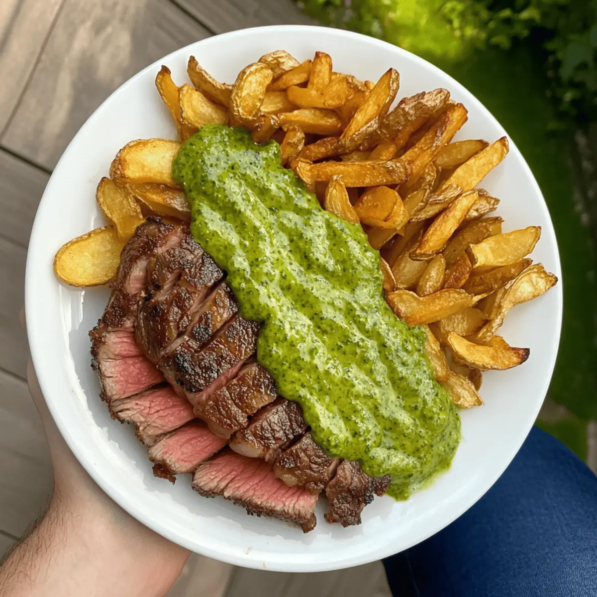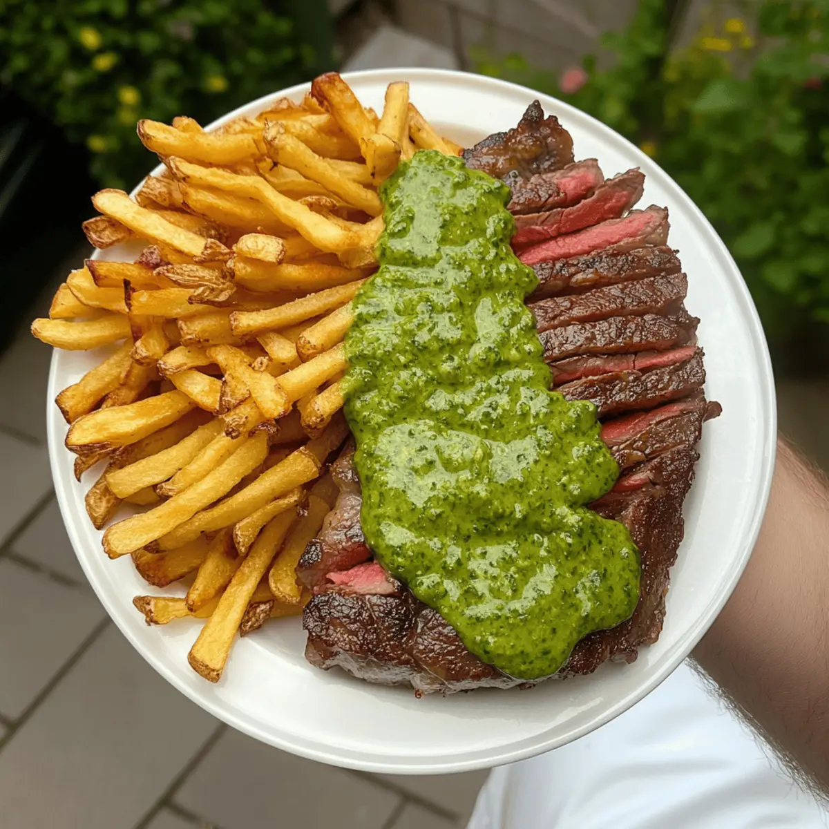 Once everything is ready, plate your Steak Frites with the crispy oven chips arranged on the side. Drizzle the herbaceous green sauce generously over the steak, and garnish with a sprinkle of fresh herbs if desired. This combination creates a beautiful presentation that is both inviting and irresistible!