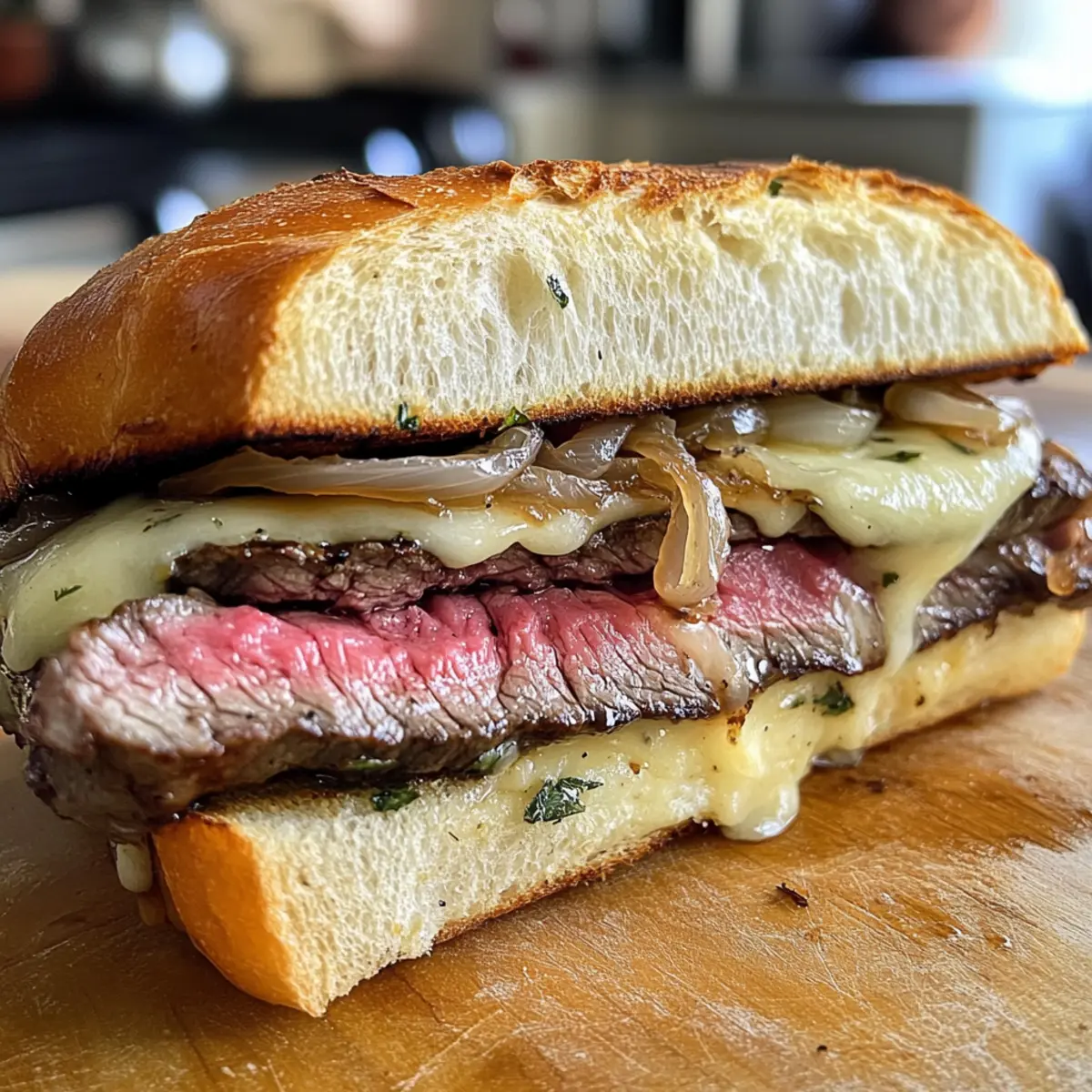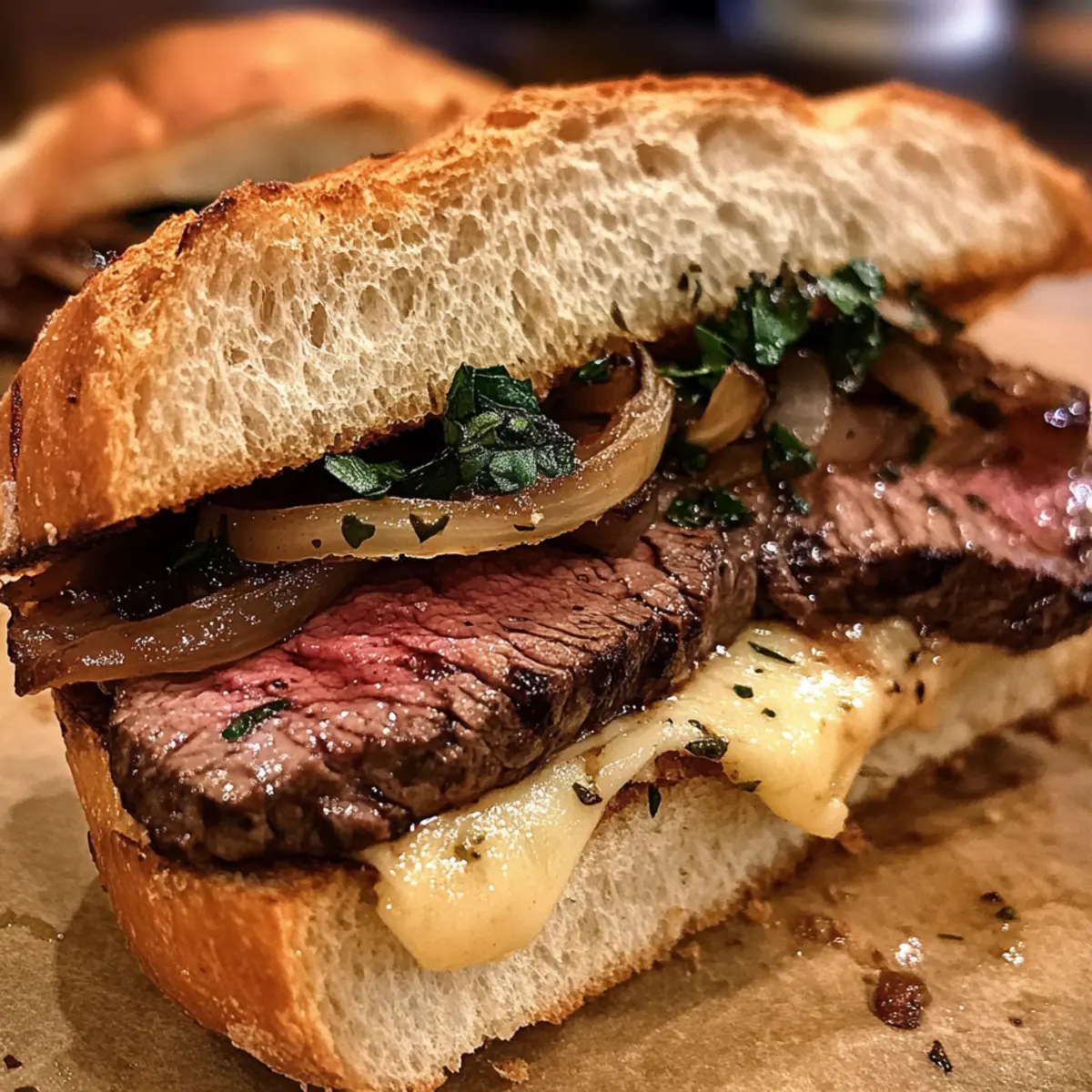Jump to Recipe Print RecipeThe sizzle of steak on a hot skillet is enough to make anyone’s mouth water, isn’t it? Today, I’m inviting you to create a culinary masterpiece with my Ultimate Ribeye Steak Sandwich with Herb Garlic Butter. This isn’t just any sandwich – it’s an experience, featuring juicy ribeye strips, sweet caramelized onions, and creamy Havarti cheese, all embraced by a perfectly toasted baguette. What I adore about this recipe is its versatility – you can whip it up for a quick, satisfying weeknight dinner or impress guests at your next gathering. Plus, it’s easy to customize with different cuts of steak or your favorite toppings, making it as unique as you are. Are you ready to savor every bite? Let’s dive into the recipe! Why Is This Steak Sandwich a Game Changer? Deliciously Unique: This sandwich combines juicy ribeye steak with delightful herb garlic butter, making every bite melt-in-your-mouth tasty. Quick Meal Solution: Perfect for busy weeknights, it’s ready in under 30 minutes! Customizable Flavors: Feel free to swap in different steak cuts or cheeses; the possibilities are endless! Elevated Presentation: Serve it under the broiler for a golden, bubbly finish that impresses. Crowd-Pleasing Option: Ideal for gatherings, pair it with a side of crispy fries or a fresh salad for a complete meal. For more delicious ideas, check out my Cheese Steak Homemade recipe! Steak Sandwich Ingredients For the Herb Garlic Butter • Unsalted Butter – Adds richness and creaminess; substitute with olive oil for a lighter option. • Fresh Dill – Imparts a fresh flavor to the butter; parsley or cilantro can be used as substitutes if needed. • Garlic Cloves – Delivers aromatic depth; garlic powder works as a substitute in a pinch. For the Sandwich • Steak (Ribeye) – The star ingredient that provides flavor and tenderness; can swap for NY strip or top sirloin. • Salt – Enhances overall flavor; adjust according to personal taste preferences. • Large Yellow Onion – Adds sweetness and texture when caramelized; shallots offer a milder alternative. • Havarti Cheese – Melts beautifully and adds creaminess; consider provolone or mozzarella for different textures. • Baguette – Provides a crunchy exterior and soft interior, perfect for sandwiches; sourdough or ciabatta make great alternatives. Step‑by‑Step Instructions for Ultimate Ribeye Steak Sandwich with Herb Garlic Butter Step 1: Prepare Herb Butter In a mixing bowl, combine softened unsalted butter with crushed garlic cloves and finely diced fresh dill. Use a fork to blend until the mixture is smooth and fully integrated, creating a fragrant herb garlic butter. Set this flavorful spread aside, allowing the ingredients to meld while you prep the steak and other components of your ultimate steak sandwich. Step 2: Slice Steak Chill the ribeye steak in the freezer for about 30 minutes to firm it up, which will make it easier to slice. Once firm, remove it and cut the meat into thin strips against the grain to ensure tenderness. Aim for pieces around 1/4 inch thick, which will yield juicy bites in your steak sandwich. Set the sliced steak aside and get ready to cook it. Step 3: Cook Steak Heat a skillet over high heat and add a splash of oil to coat the bottom. Once the oil is shimmering, add the sliced ribeye steak in a single layer, seasoning it generously with salt. Sear the steak for about 2-3 minutes until it’s nicely browned and caramelized, stirring occasionally. Remove the steak from the skillet and let it rest, allowing the flavorful juices to settle. Step 4: Sauté Onions In the same skillet, lower the heat to medium and add the sliced large yellow onions. Sauté them for about 8-10 minutes, stirring occasionally until they are soft and golden brown, which will bring out their natural sweetness. Once caramelized, remove the onions from the skillet and set them aside, keeping those delicious flavors ready for the ultimate steak sandwich assembly. Step 5: Assemble Sandwich Take a fresh baguette and slice it lengthwise to create a pocket. Generously spread the prepared herb garlic butter on both cut sides of the bread, ensuring each bite will be burst with flavor. Layer the cooked ribeye steak strips over the bottom half, followed by a generous amount of caramelized onions and slices of creamy Havarti cheese, creating a mouthwatering stack. Step 6: Broil Preheat your broiler to high. Carefully place the open sandwich on a baking sheet and slide it under the broiler for about 2 minutes. Keep a close eye on it, as the goal is to melt the cheese to gooey perfection and achieve a bubbly, golden finish without burning the bread. This step transforms your steak sandwich into a truly indulgent treat. Step 7: Serve Warm Once bubbly and golden, remove the sandwich from the broiler and let it cool for a minute before slicing it into portions. Serve immediately while everything is still hot and melty, allowing everyone to savor the wonderful combination of flavors and textures in your ultimate ribeye steak sandwich. What to Serve with Ultimate Ribeye Steak Sandwich The perfect steak sandwich deserves some fantastic companions to round out your meal experience. Crispy Fries: Crisp, golden fries deliver a nostalgic crunch that complements the tender, juicy steak, making each bite even more satisfying. Fresh Green Salad: A light salad with mixed greens and a zesty vinaigrette provides a refreshing contrast, cutting through the richness of the sandwich. Garlic Butter Mushrooms: Sautéed in the same herb garlic butter, these mushrooms add an earthy flavor that echoes the sandwich’s richness, enhancing the overall meal. Coleslaw: A crunchy, tangy coleslaw brings brightness and balance to the meal, an ideal side that adds texture and a bit of acidity. Roasted Veggies: Colorful roasted vegetables, such as bell peppers and zucchini, provide sweetness and a beautiful visual appeal, making the meal feel