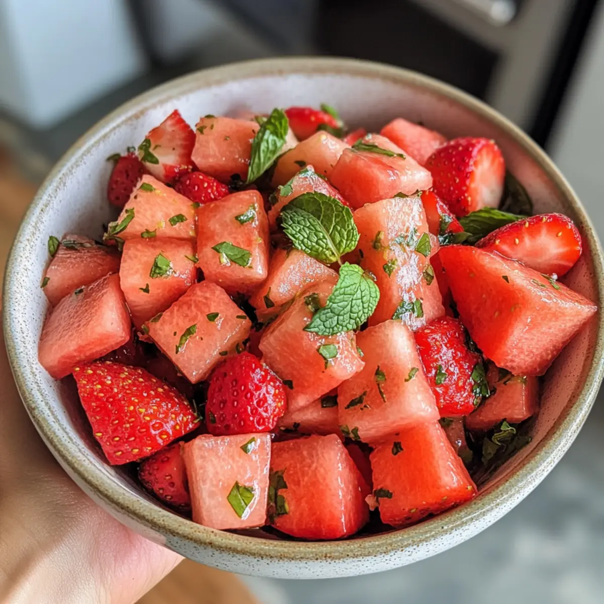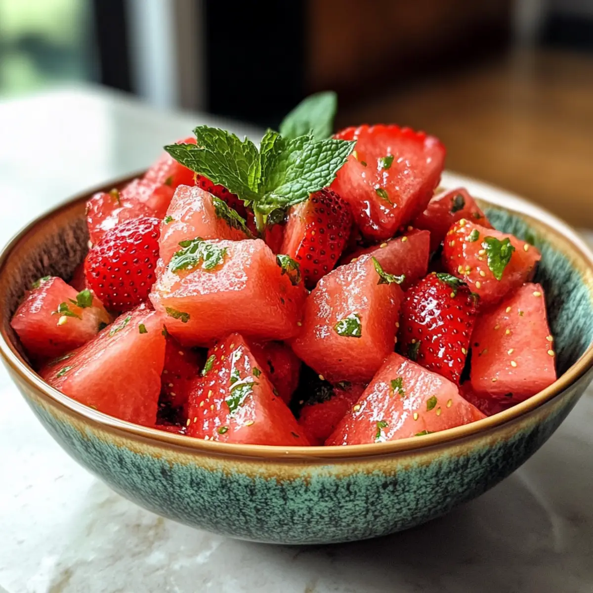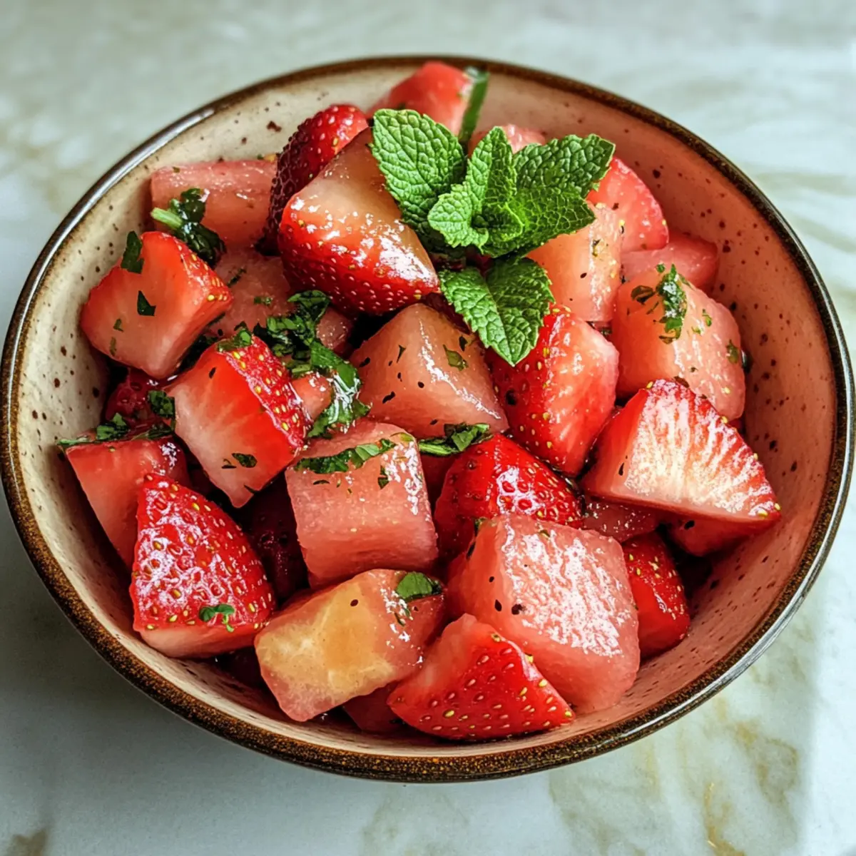 Jump to Recipe Print RecipeAs I walked through the farmers’ market last weekend, the vibrant reds of ripe strawberries and the luscious greens of fresh watermelon caught my eye. The result? A mouthwatering vision of a Strawberry Watermelon Salad with Refreshing Honey, just waiting to be made. This no-cook wonder not only offers a delectable balance of sweet and juicy flavors, but it also serves as a refreshing summer side that will hydrate and energize you on even the hottest days. With minimal prep time, you’ll find that it’s the perfect addition to backyard BBQs or a light dessert to cool off after a long day. Curious how to whip up this hydrating delight? Let’s dive in! Why will you adore this salad? Refreshing, this Strawberry Watermelon Salad with Refreshing Honey is a delightful escape from heavy, greasy meals, offering a light and hydrating alternative perfect for summer. Effortless preparation means anyone can whip this up in minutes, making it an ideal dish for spontaneous gatherings. Vibrant flavors of sweet watermelon and strawberries, combined with zesty honey-lime dressing, will leave your taste buds dancing. Versatile serving options allow you to mix in nuts or cheese for added flair, and don’t forget, it’s gluten-free! Serve it at your next BBQ or picnic to impress guests and escape the fast food rut. Strawberry Watermelon Salad with Refreshing Honey Ingredients • This salad is not only delicious but also incredibly easy to prepare! For the Salad Watermelon – the juicy base of the salad; use ripe watermelon for optimal sweetness. Strawberries – adds vibrant color and natural sweetness; opt for fresh, ripe ones instead of frozen. For the Dressing Honey – a sweetener that enhances the fruits’ natural sugars; substitute with agave syrup for a vegan option. Lime Juice – imparts zesty acidity that balances the sweetness; freshly squeezed juice is best. For Garnish (optional) Mint – adds a refreshing herbal note; substitute with basil or cilantro to mix up the flavors. With these simple ingredients, you’ll be on your way to creating a delightful Strawberry Watermelon Salad with Refreshing Honey that’s perfect for every summer occasion! Step‑by‑Step Instructions for Strawberry Watermelon Salad with Refreshing Honey Step 1: Prepare the Fruit Start by dicing the watermelon into bite-sized cubes and slicing the strawberries. Aim for uniform pieces to ensure even flavor in every bite. For an extra refreshing effect, chill the diced fruit in the refrigerator for at least 30 minutes before assembling the salad. The refreshing colors of the watermelon and strawberries will awaken your senses, setting the stage for a delightful dish. Step 2: Make the Dressing In a small mixing bowl, combine ¼ cup of honey with the juice of one freshly squeezed lime. Use a whisk to thoroughly blend the ingredients until you achieve a smooth and cohesive dressing. This mixture should have a pleasant balance of sweet and tangy notes, perfectly complementing the fresh fruit. Set the dressing aside while you prepare the salad. Step 3: Combine Ingredients In a large mixing bowl, gently toss the chilled watermelon cubes and sliced strawberries together. Before adding the dressing, drain any excess juice from the fruits to prevent the salad from becoming watery. Once combined, pour the honey-lime dressing over the fruit and gently mix until everything is well-coated with the delightful dressing. Step 4: Serve Transfer the Strawberry Watermelon Salad with Refreshing Honey to a chilled serving bowl to keep the salad crisp and cool. This final touch not only enhances the presentation but also ensures that each bite remains as refreshing as possible. Ideally, serve the salad immediately to enjoy the vibrant flavors and textures at their best. Expert Tips for Strawberry Watermelon Salad Choose Ripe Fruits: Always select ripe, fresh watermelon and strawberries for the best flavor. Avoid using frozen strawberries as they can become mushy. Chill Ingredients: For maximum refreshment, chill both the fruits and the serving bowl beforehand. This keeps the Strawberry Watermelon Salad with Refreshing Honey cool and crisp. Drain Excess Juice: Before mixing, make sure to drain any excess juice from the watermelon. This prevents the salad from becoming watery and keeps it appealing. Mix Dressing Just Before Serving: To maintain the crispness of the fruits, whisk the honey-lime dressing just before combining it with the salad. Experiment with Garnishes: Feel free to add herbs like mint or basil for extra flavor, or even sprinkle some nuts for crunch. Versatility is key to enhancing this refreshing dish! Make Ahead Options This Strawberry Watermelon Salad with Refreshing Honey is perfect for busy home cooks looking to save time! You can prep the watermelon and strawberries up to 24 hours in advance by dicing and slicing them, then storing them in an airtight container in the refrigerator. Keep the honey-lime dressing separate until you’re ready to serve, allowing it to remain fresh and flavorful. Simply whisk the dressing right before combining it with the chilled fruit, ensuring the salad retains its vibrant taste and texture. With these make-ahead tips, you’ll have a delightful, refreshing salad ready to impress your guests at a moment’s notice! How to Store and Freeze Strawberry Watermelon Salad with Refreshing Honey Room Temperature: It’s best to enjoy the salad immediately, as it can become watery if left out too long. If necessary, keep at room temperature for no more than 1 hour. Fridge: Store leftovers in an airtight container for up to 2 days. To maintain flavor, avoid mixing the dressing until you’re ready to serve again. Freezer: Freezing is not recommended for this salad, as both watermelon and strawberries can lose their texture once thawed. Enjoy fresh for the best experience. Reheating: This dish is best served cold and does not require reheating. For ultimate freshness, 