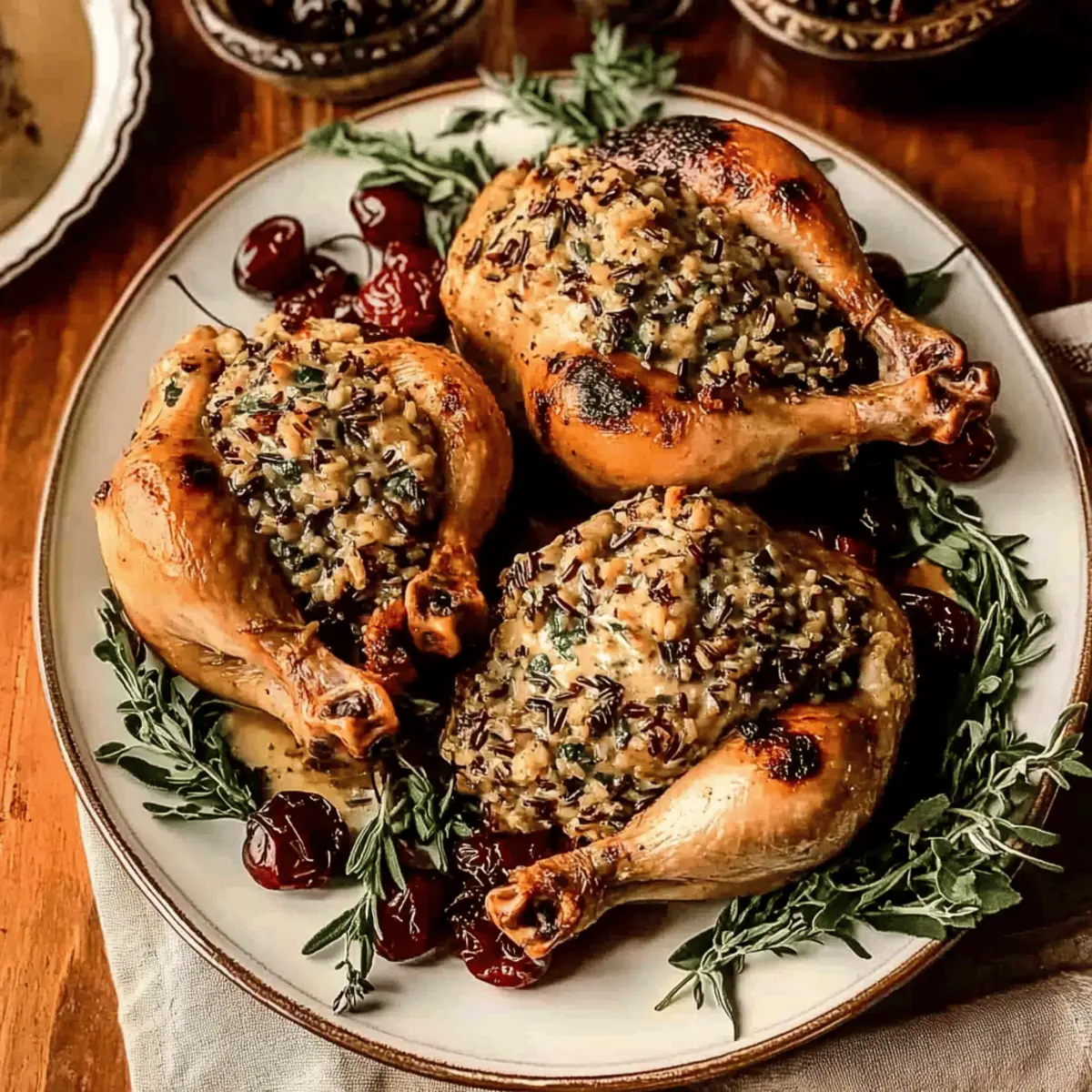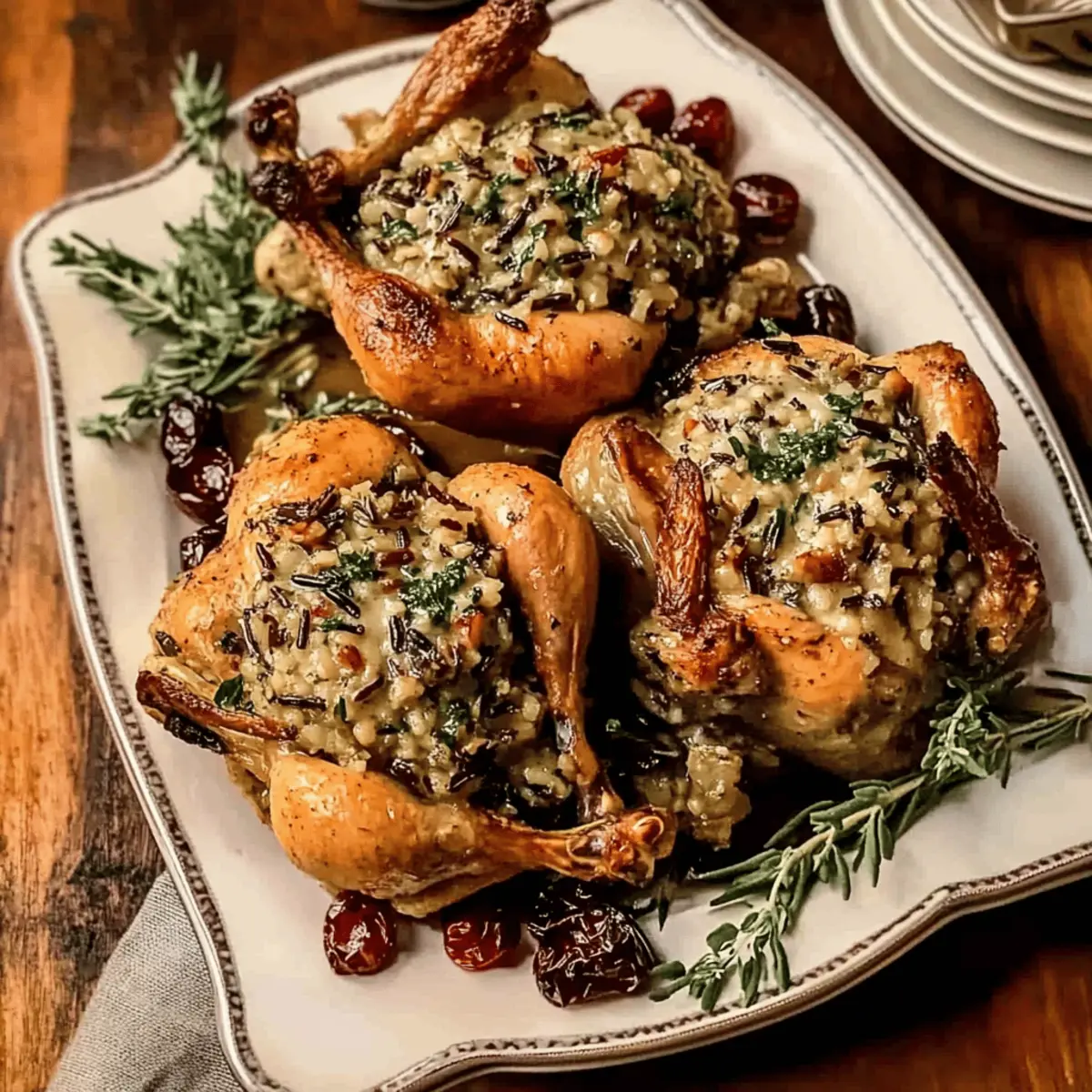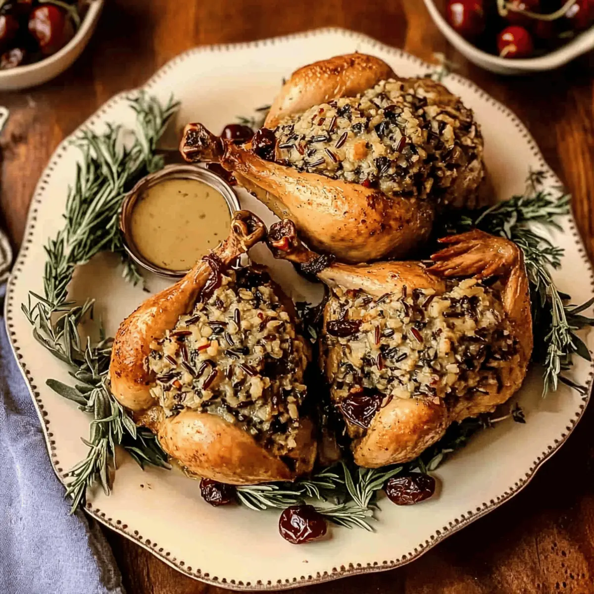 A delicious recipe for Stuffed Cornish Hens that combines savory flavors and beautiful presentation for any festive occasion.