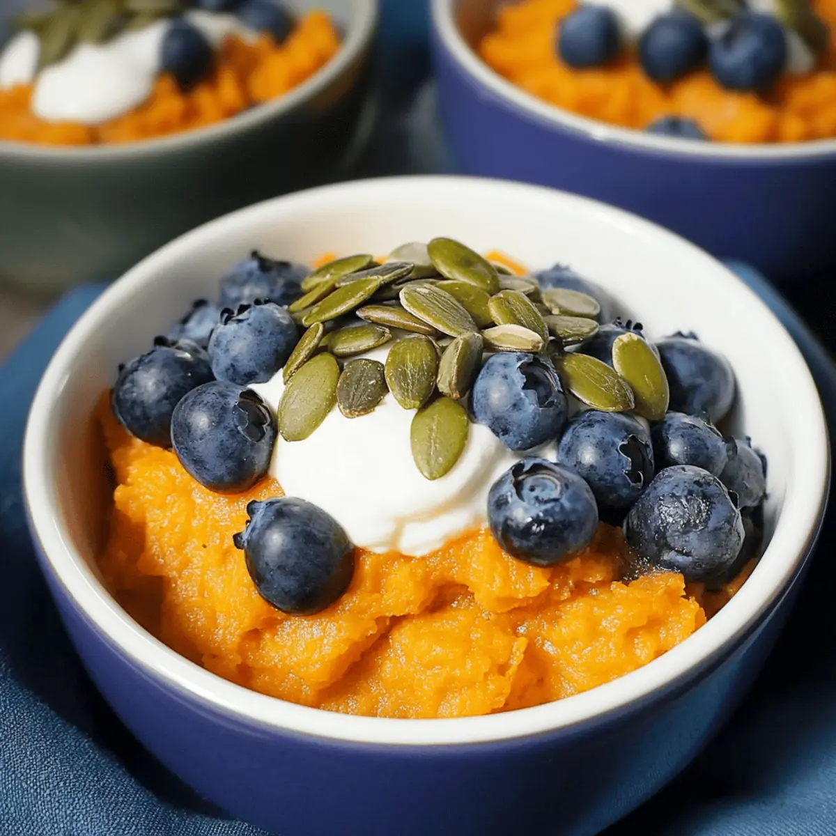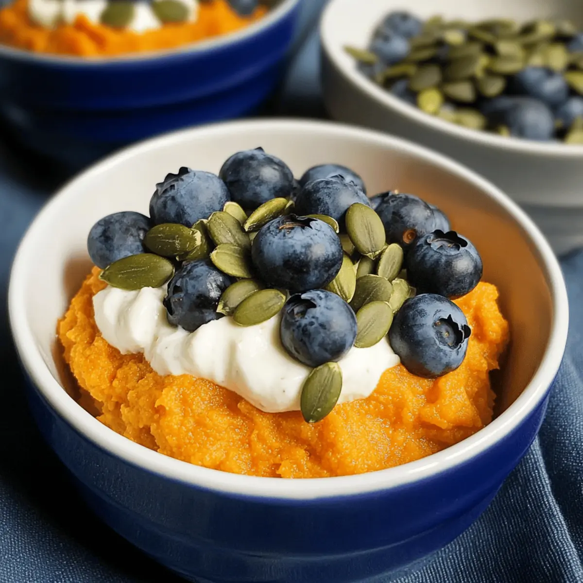 Divide the whipped sweet potato mixture into 4 inviting bowls, serving a generous scoop in each. The warm, vibrant color of the sweet potato base creates a lovely backdrop for your toppings. Top each bowl with fresh blueberries, a handful of crunchy pumpkin seeds, and a dollop of Greek yogurt to provide that creamy element, making your Sweet Potato Breakfast Bowl both nutritious and visually appealing.