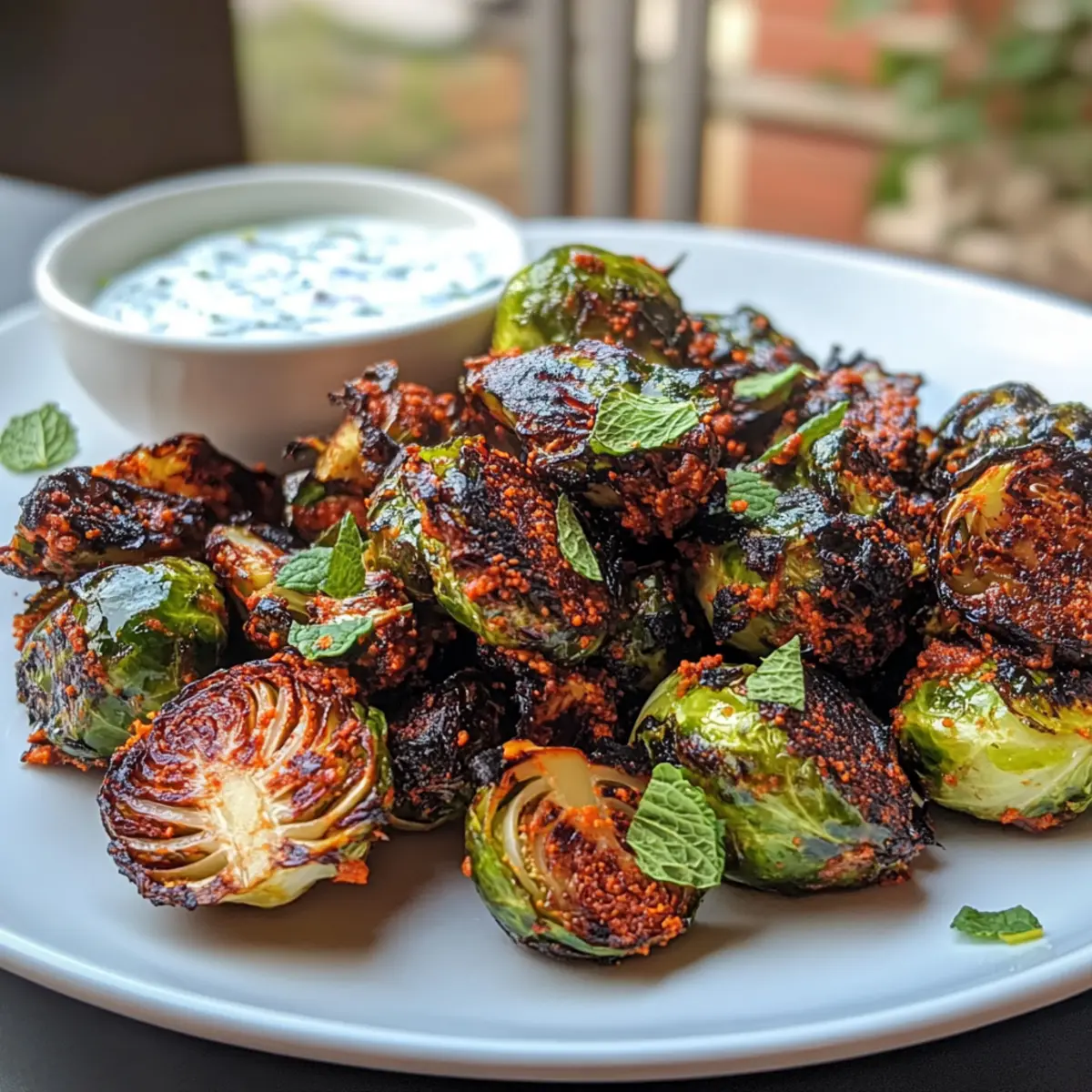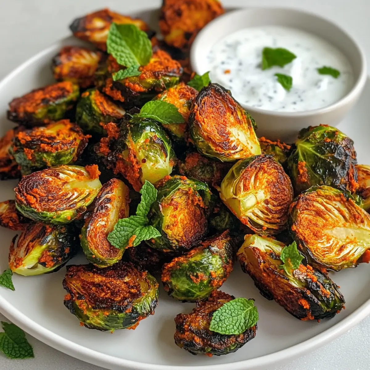 Jump to Recipe Print RecipeThe moment I roasted these Brussels sprouts, a delightful aroma filled my kitchen, transporting me straight to colorful markets buzzing with Indian spices. These Tandoori Brussels Sprouts are a game-changer—transforming an often-underappreciated vegetable into a crispy, flavorful side dish that’s perfect for any occasion. Not only are they easy to whip up, but they also pack a punch of healthiness, making them a guilt-free indulgence for your dinner table. Picture serving this vibrant dish at your next gathering, where everyone will be wondering how something so simple could taste so extraordinary. Ready to impress your family and friends? Let’s dive into this delicious recipe and bring a little spice to your kitchen adventures! Why Are These Brussels Sprouts So Irresistible? Crispy Texture: Roast these sprouts to golden perfection for a satisfying crunch that elevates any meal. Bursting Flavor: Marinated in zesty tandoori spices, each bite explodes with vibrant Indian-inspired flavors, making it hard to stop at just one! Easy Preparation: In just 25 minutes, you can whip up this impressive side dish, perfect for weeknight dinners or special occasions. Versatile Pairing: Serve them with everything from Indian curries to pasta, or even on top of salads for an added crunch. You might also want to try these alongside our Garlicky Brussels Sprouts for a delightful twist! Healthy Indulgence: Guilt-free and packed with nutrients, they’re a fantastic way to enjoy veggies while treating your taste buds. Crowd-Pleasing: Impress family and friends with this unique veggie side that promises to be the star of the table! Tandoori Brussels Sprouts Ingredients For the Sprouts • Brussels Sprouts – Fresh and crisp, these provide the perfect bitterness to contrast with the spices. • Unsalted Butter (4 tbsp) – Adds richness and helps in browning; substitute with ghee for an authentic touch. • Mustard Oil (2 tbsp) – Delivers a sharp flavor; swap with olive oil if necessary. For the Spice Blend • Tandoori Masala (2 tbsp) – This key ingredient adds warmth and depth; feel free to use homemade. • Chaat Masala (1 tsp) – Essential for tanginess; don’t skip this for authentic flavor. • Kashmiri Red Chili Powder (1 tsp) – For vibrant color and mild heat; replace with regular chili powder for more kick. • Turmeric Powder (½ tsp) – Adds earthy flavor and a rich yellow hue. • Black Pepper Powder (½ tsp) – Enhances the overall spice profile. • Cumin Powder (1 tsp) – Contributes a warm, nutty flavor to the mix. • Black Salt (¼ tsp) – Offers a unique taste; regular salt can substitute in a pinch. • Kasoori Methi (1 tsp) – Dried fenugreek leaves that enhance aroma; crush before use for better flavor. For the Crunch & Finish • Sugar (1 tsp) – Provides a hint of sweetness to balance the heat and spices. • Parmesan Cheese (⅓ cup) – Adds umami and creaminess; nutritional yeast is a good vegan alternative. • Panko Bread Crumbs (¼ cup) – Ensures extra crunch; regular breadcrumbs are a less crispy substitute. • Lemon Juice (1 tbsp) – Brightens the dish with a burst of citrus freshness. For the Minty Yogurt Sauce • Greek Yogurt – Acts as a creamy base; perfect for cooling down the spice. • Cilantro & Mint – Fresh herbs that elevate the sauce’s flavor. • Scallions & Jalapeño – Add a touch of onion and heat; adjust spice level as desired. These Tandoori Brussels Sprouts ingredients come together to create a delightful, crispy dish that’s sure to impress at your next gathering! Step‑by‑Step Instructions for Tandoori Brussels Sprouts Step 1: Preheat the Oven Begin by preheating your oven to 425°F (220°C). This temperature is perfect for achieving that coveted crispy texture on your Tandoori Brussels Sprouts. Make sure your oven is fully heated before moving on to the preparation of the Brussels sprouts, as this will ensure an even roast. Step 2: Prepare the Brussels Sprouts Rinse and thoroughly dry your Brussels sprouts to remove any grit. Trim the ends off and slice each sprout in half, ensuring that they are uniform for even cooking. This step is crucial for maximizing flavor and texture, as the cut sides will caramelize beautifully during roasting. Step 3: Coat the Brussels Sprouts In a large bowl, melt the unsalted butter and combine it with mustard oil and all the spices, creating a fragrant marinade. Toss the halved Brussels sprouts in this mixture until they are fully coated, ensuring each piece is enveloped in the flavorful Tandoori spices. The vibrant colors will be an indicator that they are well-mixed. Step 4: Arrange on Baking Sheet Spread the coated Brussels sprouts in a single layer on a baking sheet, with the cut sides facing down. This positioning is key for achieving crispy edges; overcrowding can lead to steaming rather than roasting. Make sure there’s some space between each sprout to allow air circulation. Step 5: Roast to Perfection Place the baking sheet in the preheated oven and roast the Brussels sprouts for 22-25 minutes. Keep an eye on them, and look for a golden-brown hue plus some crispy charred edges, which indicates they are perfectly roasted. The aroma will be irresistible! Step 6: Prepare the Minty Yogurt Sauce While the sprouts are roasting, make your refreshing minty yogurt sauce. In a blender, combine Greek yogurt, cilantro, mint, scallions, and jalapeño, then blend until smooth but still slightly textured. Adjust the spice level according to your taste preferences, and set this sauce aside while the sprouts finish roasting. Step 7: Serve and Enjoy Once the Tandoori Brussels Sprouts are crispy and caramelized, remove them from the oven and let them cool slightly. Serve them immediately, either drizzled with the minty yogurt sauce or on the side for dipping. This dish not only elevates your table but also showcases how delicious healthy eating can be! Expert Tips for Tandoo