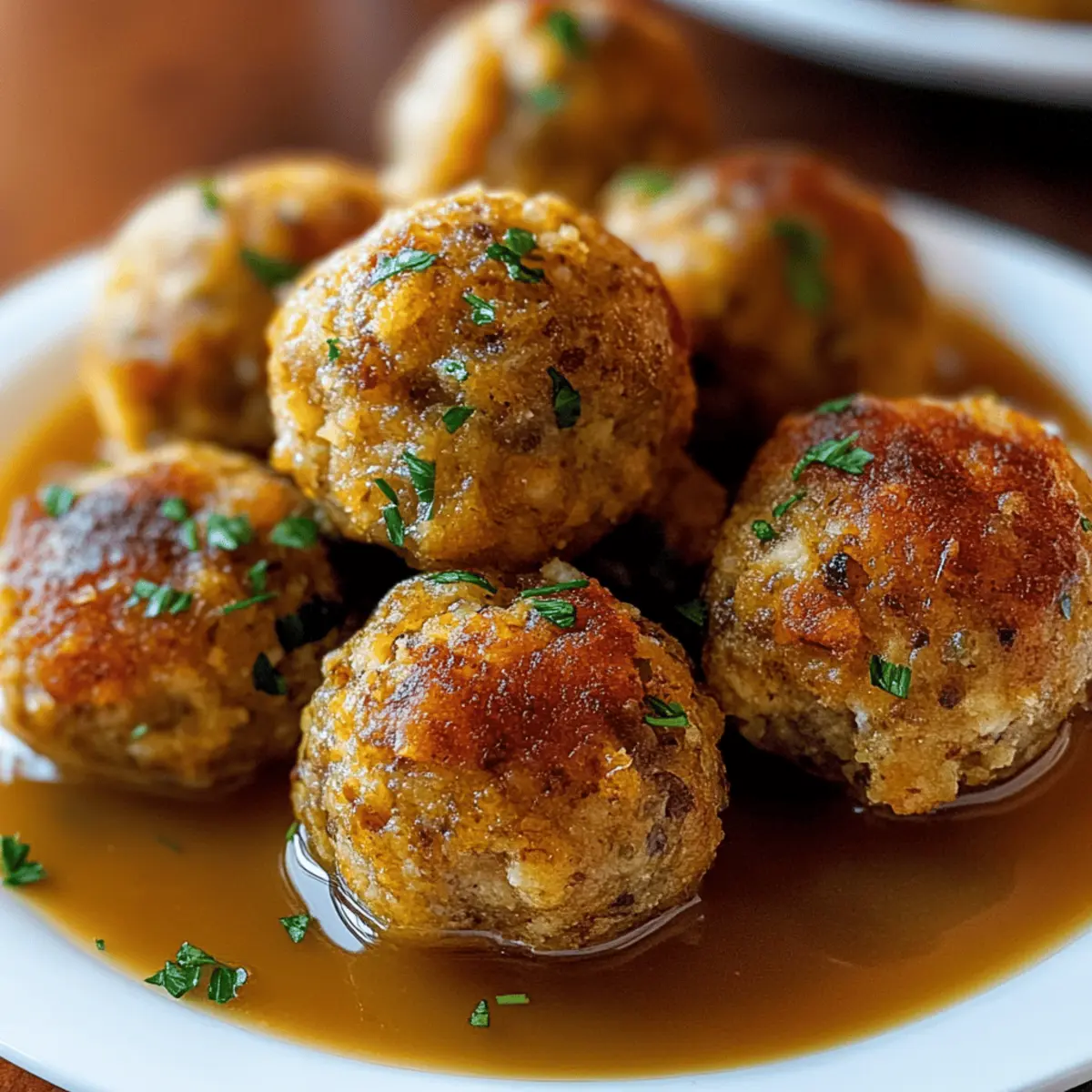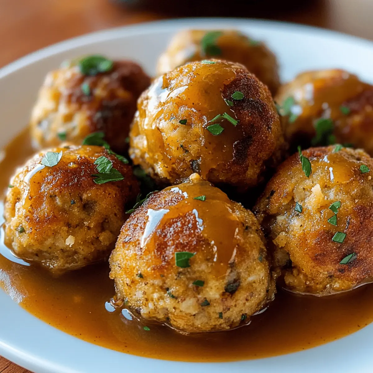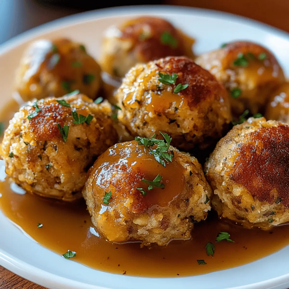 Jump to Recipe Print RecipeAs I stood in my kitchen surrounded by the warm scents of herbs and butter, I thought about the years I’ve spent perfecting my holiday recipes. This year, I’m excited to share my Thanksgiving Stuffing Balls, a make-ahead treat that brings a twist to our beloved classic stuffing. Imagine a crispy, golden exterior giving way to a soft, flavorful center—these bite-sized morsels are not just a festive side dish; they’re the perfect appetizer for your holiday gatherings. With endless possibilities for customization, including savory sausage or sweet cranberries, you can tailor them to satisfy all your guests. Plus, they allow you to save precious time by prepping in advance! Isn’t it time to elevate your holiday menu? Let’s dive into this delicious recipe! Why Are Thanksgiving Stuffing Balls So Irresistible? Deliciously Customizable: These stuffing balls offer endless mix-in possibilities, letting you personalize them with crispy bacon, seasonal herbs, or even a touch of spice. Make-Ahead Convenience: No need to scramble last minute! Prepare them a day in advance or freeze to make holiday hosting a breeze. Crowd-Pleasing Appeal: Perfectly sized for snacking, they are great for gatherings; everyone loves a tasty bite that’s easy to enjoy while mingling. Texture Perfection: With a golden, crispy exterior and soft, savory interior, they provide a delightful contrast that keeps everyone coming back for more. Versatile Serving Options: Serve them with rich gravy or sweet cranberry sauce for a delectable twist. Looking for more ideas? Try pairing with Sticky Mongolian Meatballs for an exciting spread! Thanksgiving Stuffing Balls Ingredients • Dive into the delicious components! For the Base Day-old Bread – Use about 14 oz of bread cut into small cubes for optimal texture—fresh bread will become soggy. Unsalted Butter – Essential for flavor and achieving a crispy exterior. Large Eggs – Helps the stuffing balls hold shape; do not omit. For the Flavor Onion – Finely chopped for even distribution within the stuffing. Celery – Finely chopped; contributes to the classic stuffing flavor. Garlic – Minced to add depth of flavor; adjust amount according to taste. Poultry Seasoning or Herbs (sage and thyme) – Use whichever is preferred; fresh herbs add aromatic flair. Salt & Black Pepper – Essential for overall flavor enhancement; adjust to taste. Fresh Parsley – Chopped for a pop of color and freshness. For Moisture and Richness Chicken or Turkey Broth – Keeps the stuffing blend moist but ensure it’s not overly wet; add more as necessary. Grated Parmesan Cheese – Adds richness, but can be omitted for a lighter option. These Thanksgiving Stuffing Balls are sure to impress with their delightful taste and texture, making them a standout dish this holiday season! Step‑by‑Step Instructions for Thanksgiving Stuffing Balls Step 1: Prepare Bread Base Spread day-old bread cubes evenly on a baking sheet and place them in a preheated oven at 300°F (150°C). Toast the bread for 10–12 minutes until they are dry but not browned. This step helps achieve the perfect texture for your Thanksgiving Stuffing Balls, ensuring they won’t become soggy when mixed with the other ingredients. Step 2: Cook Veggies In a large skillet, melt 4 tablespoons of unsalted butter over medium heat. Add finely chopped onion, celery, and minced garlic. Sauté for 6–8 minutes, stirring occasionally, until the vegetables are softened and fragrant. This mixture will enhance the flavor of your stuffing balls, bringing warmth and depth to every bite. Step 3: Mix Stuffing In a spacious mixing bowl, combine the toasted bread cubes, sautéed vegetables, poultry seasoning, salt, black pepper, chopped parsley, and optional grated Parmesan cheese. Use a spatula to mix these ingredients thoroughly. Then, crack in 2 large eggs and gradually pour in enough chicken or turkey broth until the mixture is moist but not soggy, creating a perfect consistency for forming stuffing balls. Step 4: Shape Balls With damp hands (to prevent sticking), scoop out portions of the stuffing mixture and shape them into balls roughly the size of golf balls. Arrange the formed balls on a greased or parchment-lined baking sheet. Ensure they are packed tightly but not overly compressed, as this will help them achieve a delightful texture when baked. Step 5: Bake Preheat your oven to 375°F (190°C) and carefully place the baking sheet with the stuffing balls inside. Bake for 20–25 minutes, keeping an eye on them as they turn golden brown and crispy on the outside. They should look perfectly toasted and have a lovely aroma, signaling that your Thanksgiving Stuffing Balls are almost ready. Step 6: Serve Warm Once baked, remove the Thanksgiving Stuffing Balls from the oven and let them cool for a few minutes. Transfer them to a serving platter and enjoy warm, perfect for dipping into rich gravy or sweet cranberry sauce. These delightful bites are now ready to impress your guests and complete your holiday spread! Make Ahead Options These Thanksgiving Stuffing Balls are perfect for busy holiday planners looking to save time! You can prepare the stuffing balls up to 24 hours in advance by assembling and refrigerating them. Simply follow the shaping instructions and arrange them on a baking sheet. Cover tightly with plastic wrap to maintain their moisture and flavor. When you’re ready to serve, just preheat your oven and bake them as directed, adding a few extra minutes if they’re coming straight from the fridge. Alternatively, for longer storage, freeze unbaked stuffing balls on a tray, then transfer to a freezer bag for up to 3 months. Bake directly from frozen, extending the cooking time by about 5–7 minutes, ensuring they remain just as delicious! How to Store and Freeze Thanksgiving Stuffing Balls Fridge: Store leftovers in an airtight container for up to 3 days. Reheat in the oven at 350°F (175°C) 