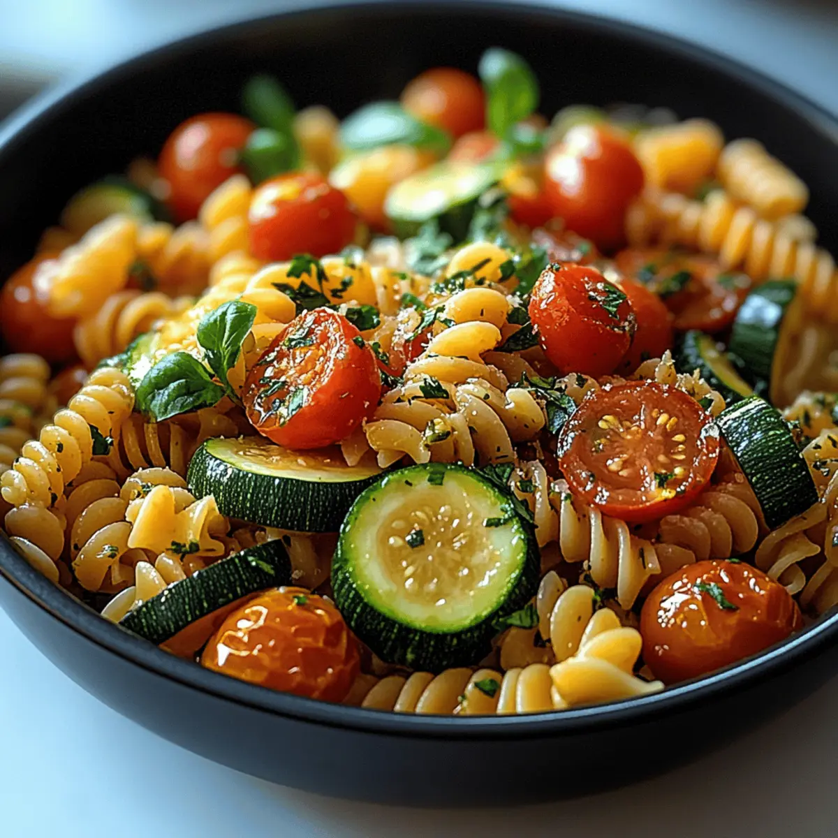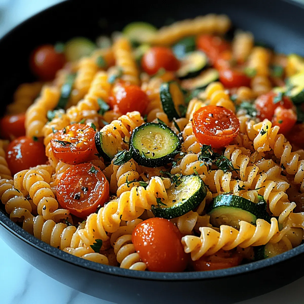 Jump to Recipe Print RecipeThe aroma of sautéed garlic mingling with fresh tomatoes takes me back to warm summer evenings in my kitchen. There’s something truly comforting about a dish that brings together simple, seasonal ingredients, like in this Tomato Zucchini Pasta. In just 30 minutes, you can whip up a healthy, vibrant meal that’s not only delicious but also a breeze to prepare. This easy vegetarian dinner is a great way to indulge in a satisfying bowl of pasta without the guilt, making it perfect for busy weeknights. So, are you ready to add a delightful twist to your dinner routine? Let’s dive into this recipe that celebrates flavor and freshness! Why is Tomato Zucchini Pasta a Must-Try? Quick and Easy: In just 30 minutes, you can enjoy a delicious homemade meal that beats fast food any day. Vibrant Flavors: The combination of fresh zucchini and sweet cherry tomatoes creates a taste explosion. Healthy Choice: Packed with vitamins and low in calories, it’s guilt-free comfort food. Versatile Dish: Switch up the veggies or add grilled chicken for a heartier meal. Plus, if you’re looking for more veggie inspiration, check out my Street Corn Pasta or Tomato Herby Bean salads for a refreshing side! Crowd-Pleaser: Perfect for family dinners or entertaining friends—everyone will love this dish! Tomato Zucchini Pasta Ingredients • For the Base Pasta – 8 ounces; use your favorite shape like rotini or penne for the best texture. Zucchini – 2 medium; adds freshness and bulk; you can swap in yellow squash if desired. • For the Sauce Cherry Tomatoes – 2 cups; brings sweetness and acidity, or you can use fresh diced tomatoes in a pinch. Garlic – 3 cloves; infuses the dish with aromatic flavor—sub garlic powder (1/2 teaspoon) in a hurry. Olive Oil – 3 tablespoons; ideal for sautéing vegetables and enhancing richness; substitute with avocado oil if needed. • For the Seasoning Fresh Basil – ¼ cup, chopped; provides a lovely herbal burst; dried basil (1 tablespoon) works in a pinch, but fresh is best. Salt and Black Pepper – to taste; adjust according to your preference for a perfectly seasoned dish. Red Pepper Flakes – optional; add for a spicy kick, or leave out for a milder version. • For Garnish (Optional) Grated Parmesan Cheese – to taste; adds creaminess and flavor richness—omit for a vegan option. Gather these ingredients and get ready to create a delicious Tomato Zucchini Pasta that’s not only quick and healthy but also brimming with flavors! Step‑by‑Step Instructions for Tomato Zucchini Pasta Step 1: Cook the Pasta Begin by bringing a large pot of salted water to a rolling boil over high heat. Add 8 ounces of pasta and cook according to package instructions until al dente, about 8-10 minutes. Once cooked, reserve ½ cup of pasta water, then drain the pasta in a colander and set aside to prepare for the Tomato Zucchini Pasta. Step 2: Sauté the Zucchini In a large skillet, heat 2 tablespoons of olive oil over medium heat until shimmering. Add the sliced zucchini and sauté for about 3-4 minutes, stirring occasionally until it turns golden brown and tender. Once done, remove the zucchini from the skillet and place it aside, allowing the flavors to meld while you focus on the next steps. Step 3: Cook Tomatoes and Garlic Using the same skillet, add 1 tablespoon of olive oil and reduce the heat to medium-low. Sauté 3 minced garlic cloves for 30 seconds until fragrant, stirring consistently to avoid burning. Then, add 2 cups of halved cherry tomatoes along with a pinch of salt. Cook these for 5-7 minutes until the tomatoes soften, creating a juicy base for your Tomato Zucchini Pasta. Step 4: Combine Ingredients Return the sautéed zucchini to the skillet with the tomatoes and garlic. Add the drained pasta to the mixture and toss everything together gently. If the pasta seems dry, incorporate the reserved pasta water gradually, stirring until the desired consistency is achieved. The goal is to have everything evenly coated in a light, flavorful sauce. Step 5: Add Basil and Season Toss in ¼ cup of chopped fresh basil into the skillet, mixing it through the pasta for a burst of herbal flavor. Taste the mixture and adjust the seasoning by adding salt, black pepper, and optional red pepper flakes to suit your preference. This will enhance the overall taste of your Tomato Zucchini Pasta. Step 6: Serve Transfer the vibrant Tomato Zucchini Pasta to a serving dish. If desired, garnish with grated Parmesan cheese for an extra touch of richness. Serve warm and enjoy this delightful vegetarian meal, bursting with fresh flavors and perfect for a quick weeknight dinner! Expert Tips for Tomato Zucchini Pasta Reserve Pasta Water: Don’t forget to save some pasta water! Its starch is essential for creating a silky sauce that coats your Tomato Zucchini Pasta perfectly. Avoid Overcrowding: Sauté zucchini in batches if necessary. Overcrowding the skillet prevents it from browning nicely, resulting in soggy veggies. Fresh is Best: Use fresh basil for the ultimate flavor boost. Dried basil is okay, but fresh basil truly elevates the dish and makes it shine. Adjust Consistency: If the pasta seems too dry, gradually add the reserved pasta water. This simple trick keeps your dish moist and flavorful without being heavy. Customize to Taste: Feel free to adjust seasonings based on your preferences. Add more red pepper flakes for heat or extra cheese for richness in your Tomato Zucchini Pasta! What to Serve with Healthy Tomato Zucchini Pasta Imagine the vibrant aromas wafting through your kitchen as you prepare this delicious dish, inviting companions to the table for a meal filled with flavors. Garlic Bread: Perfectly toasted, buttery garlic bread is a classic companion. Its crunchy texture and comforting flavor help soak up any delicious sauce. Mixed Green Salad: A fresh garden salad with a zesty vinaigrette adds a light, crisp contrast to the pasta. The crunch of le