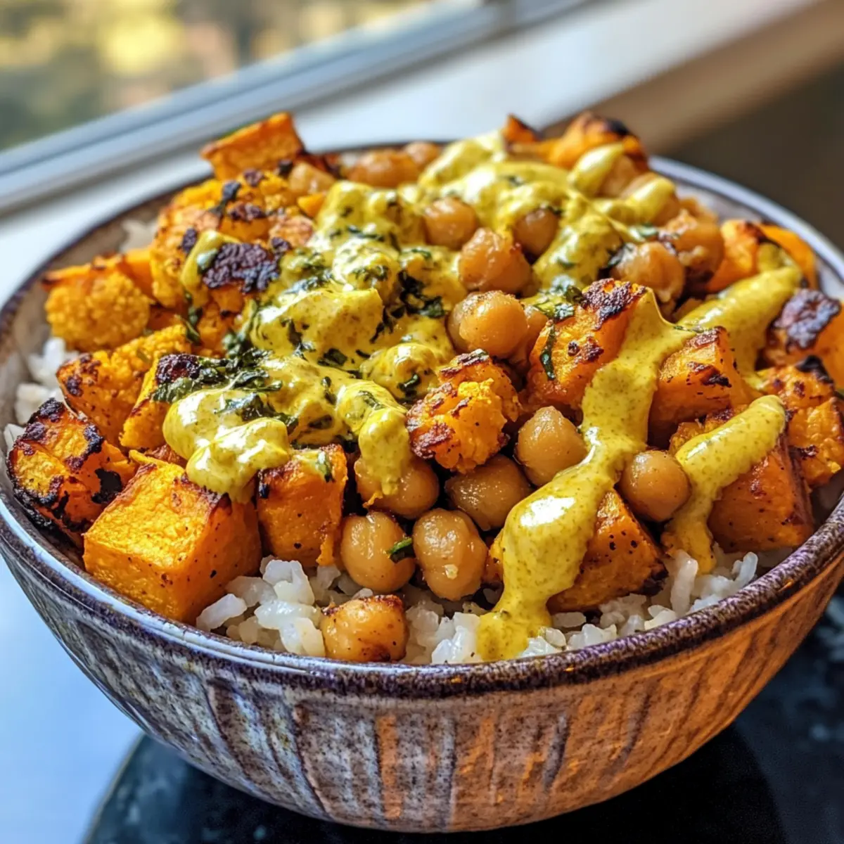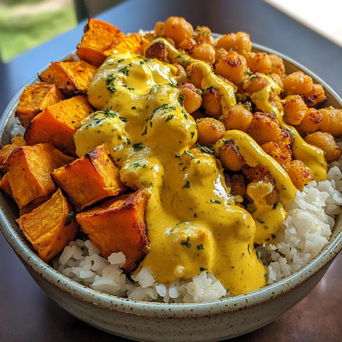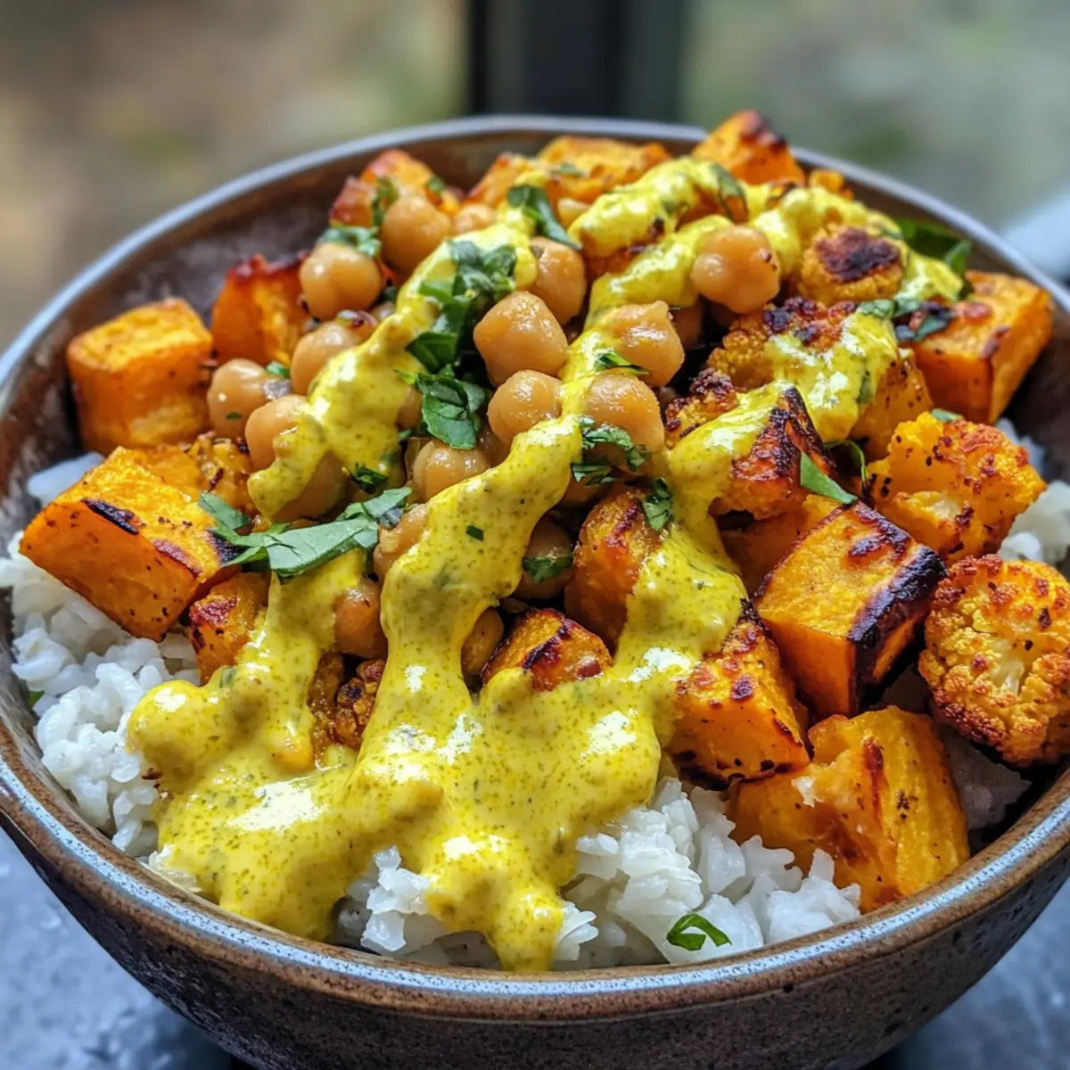 Jump to Recipe Print RecipeThe kitchen was filled with the comforting aroma of roasted vegetables, and I couldn’t help but smile as I plated my vibrant Vegan Rice Bowls with Sunshine Sauce. This satisfying meal is a celebration of simple, wholesome ingredients—think nutty sweet potatoes, crunchy cauliflower, and hearty chickpeas—all drizzled with a creamy, zesty sunshine sauce. Not only is this dish quick to prepare, but it also offers delightful flexibility to customize your grains and veggies. Perfect for meal prepping or a light summer dinner, these bowls are both nourishing and visually stunning. Are you ready to transform your dinner routine with a colorful, plant-based meal? Let’s dive in! Why are Vegan Rice Bowls a Must-Try? Vibrant, Flavorful Bowl: Packed with nutty sweet potatoes, crispy cauliflower, and hearty chickpeas, these bowls are a feast for your taste buds. Quick to Prepare: Ready in just one hour, making them ideal for busy weeknights or leisurely weekends. Flexible Ingredients: Customize grains or swap vegetables based on what you have on hand – why not try some Healthy Greek Bowls for more inspiration? Wholesome Goodness: Each bowl is nutrient-rich, offering a good source of protein, fiber, and vitamins – perfect for a balanced meal. Meal Prep Friendly: Ideal for prepping ahead; simply store components separately and enjoy delicious leftovers! Elevate your dinner with these stunning Vegan Rice Bowls drizzled in luscious sunshine sauce, and turn mundane meals into a flavorful celebration! Vegan Rice Bowls with Sunshine Sauce Ingredients Get ready to gather everything you need for these vibrant bowls! For the Roasted Vegetables Cauliflower – Adds a tender, slightly crunchy texture; substitute with broccoli for a similar bite. Sweet Potatoes – Provides natural sweetness and creaminess; butternut squash makes a delightful swap. Chickpeas – Delivers protein and heartiness; black beans can be swapped for a tasty variation. For the Base Rice – The hearty base of the bowl; quinoa or farro provide tasty alternatives for variety. Olive Oil – Essential for roasting and enhancing flavors; consider avocado oil as a substitute. For Seasoning Salt & Pepper – Important for enhancing the dish; adjust to your taste preference. Turmeric – Adds beautiful golden color and mild flavor; it can be omitted for a simpler dish. For the Sunshine Sauce Vegan Yogurt – The creamy base for the sunshine sauce; silken tofu is a great lower-calorie option. Lemon Juice – Infuses brightness and acidity; vinegar can act as a substitute if needed. Agave – Natural sweetness for the sauce; use maple syrup instead for a unique twist. Garlic Powder & Ground Ginger – Key flavor boosters for the sauce; fresh versions offer even bolder tastes. For Garnishing Green Onions – Adds a fresh crunch on top; feel free to swap in chives or shallots. Cashews – Provides texture and a nutty finish; any nuts or seeds will work beautifully here. Enjoy creating these Vegan Rice Bowls with Sunshine Sauce, a colorful meal that’s bound to brighten your dinner! Step‑by‑Step Instructions for Vegan Rice Bowls with Sunshine Sauce Step 1: Preheat the Oven Begin by preheating your oven to 400°F (200°C). While it’s heating, line two baking sheets with parchment paper. This will ensure easy cleanup and prevent sticking while you roast the vibrant vegetables in your Vegan Rice Bowls with Sunshine Sauce. Step 2: Prepare Sweet Potatoes In a large mixing bowl, toss the diced sweet potatoes with 2 tablespoons of olive oil, ½ teaspoon of salt, ¼ teaspoon of pepper, and ¼ teaspoon of turmeric. Make sure each piece is well-coated for maximum flavor. Once mixed, transfer the sweet potatoes onto one of the prepared baking sheets in a single layer. Step 3: Prepare Cauliflower and Chickpeas Next, repeat the same process with the cauliflower florets. Toss them in another bowl with olive oil, salt, and pepper, then spread them out on the second baking sheet. For an added protein boost, mix drained chickpeas with 2 tablespoons of olive oil, ½ teaspoon of salt, and ¼ teaspoon of pepper, then add them to the sheet with the cauliflower. Step 4: Roast the Vegetables Place both baking sheets in the oven and roast the sweet potatoes, cauliflower, and chickpeas for 25-30 minutes. Be sure to rotate the pans halfway through to ensure even browning and crispiness. They should be golden and tender when finished, providing a delightful texture for your rice bowls. Step 5: Cook the Rice While the vegetables are roasting, prepare your rice according to the package instructions or opt for an Instant Pot for quicker cooking. If using Instant Pot, combine rice and water, seal the lid, and set to cook for about 10 minutes, allowing it to fluff perfectly by the time the veggies are done. Step 6: Make the Sunshine Sauce In a mixing bowl, whisk together the vegan yogurt, lemon juice, agave, garlic powder, and ground ginger until the sauce is smooth and creamy. Taste and adjust the seasoning as needed, ensuring it’s tangy and flavorful—it’s the perfect drizzle for your Vegan Rice Bowls with Sunshine Sauce. Step 7: Assemble the Bowls Now it’s time to assemble your vibrant bowls! Divide the cooked rice evenly among four bowls. Top each bed of rice with a generous helping of the roasted sweet potatoes, cauliflower, and chickpeas. Drizzle the luscious sunshine sauce over the top and finish with a sprinkle of chopped green onions and cashews for added crunch. Step 8: Serve and Enjoy Finally, your Vegan Rice Bowls with Sunshine Sauce are beautifully topped and ready to serve. Invite your family or friends to enjoy this colorful and nourishing dish, celebrating the delightful combination of roasted veggies and creamy sauce in every bite! What to Serve with Vegan Rice Bowls with Sunshine Sauce Elevate your dining experience by pairing these colorful bowls with complementary dishes that tantalize the taste buds. Creamy Avo