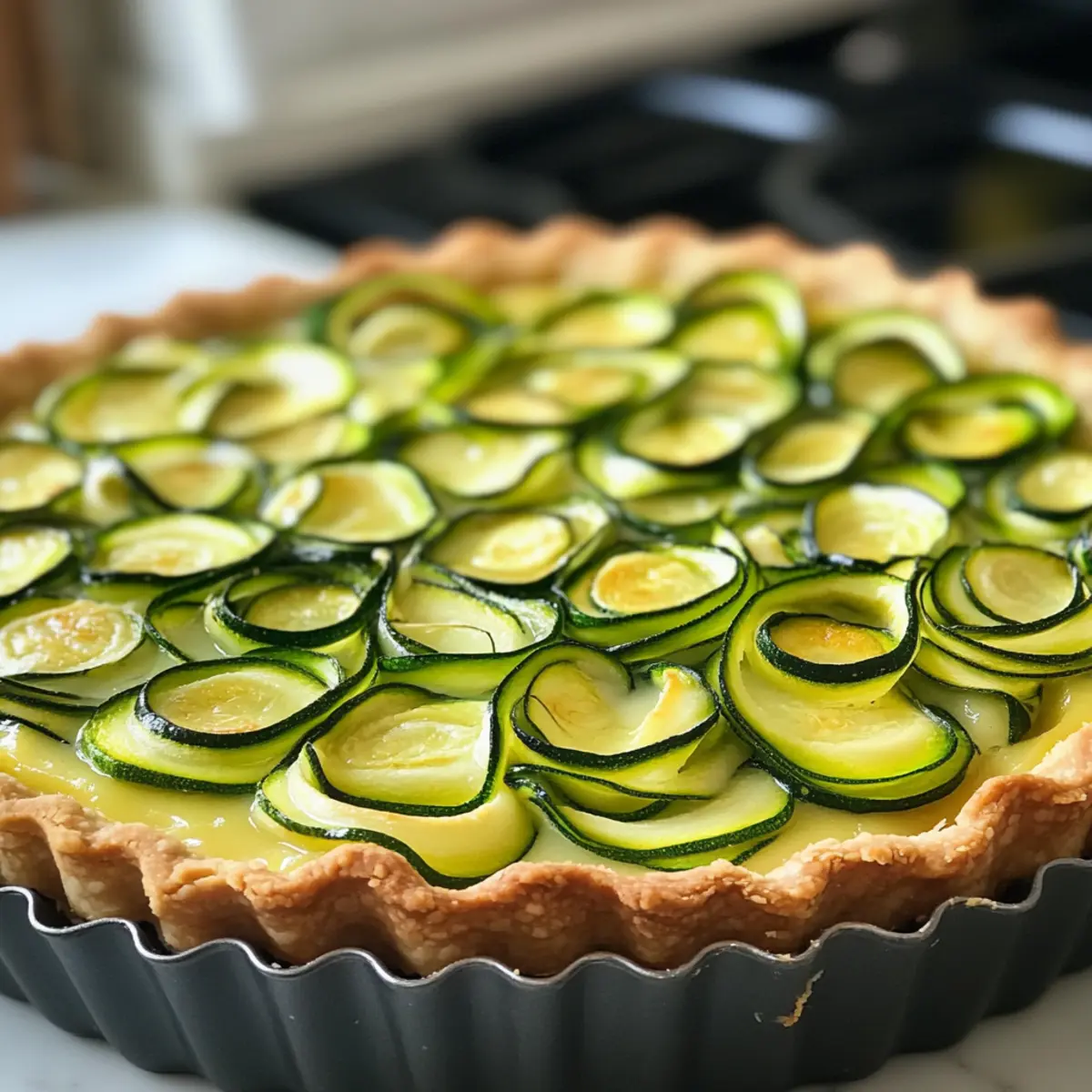 Jump to Recipe Print RecipeAs I lifted the veil of that golden pastry crust, the vibrant ribbons of zucchini nestled in a creamy custard caught my eye, promising a fusion of flavors that would soon dance on our taste buds. This “Secret Weapon” Easy Zucchini Tart is the quintessential dish for spectacular weeknight dinners or elegant gatherings, delivering both simplicity and elegance in every bite. With a burst of fresh, wholesome ingredients and a luxe custard that feels indulgent yet light, it’s a crowd-pleaser that takes mere minutes to prepare. Plus, it’s vegetarian, making it a versatile option for those looking to incorporate more plant-based meals into their repertoire. Are you ready to impress your family and friends with a dish that looks as stunning as it tastes? Let’s dive in! Why is this Easy Zucchini Tart a must-try? Simplicity: This recipe is incredibly easy to whip up, making it perfect for both novice cooks and seasoned chefs alike. Visual Appeal: The vibrant zucchini ribbons create a stunning presentation that will wow your guests on any occasion. Versatility: You can easily swap out ingredients, using seasonal vegetables like bell peppers or asparagus for a delightful twist. Crowd-Pleasing: Its creamy custard and flaky crust strike a perfect balance of flavors and textures, ensuring it will be the star of any meal. Make-Ahead Friendly: Prepare it in advance for effortless entertaining—just reheat before serving. For more delicious vegetarian ideas, don’t forget to check out these Savory Breakfast Muffins! Zucchini Tart Ingredients • Here’s everything you need to create your stunning Zucchini Tart. For the Tart Base Pie Crust – A flaky crust provides the perfect foundation; choose store-bought for convenience or make it gluten-free if needed. For the Custard Eggs – These act as a binder and create a rich texture; substitute with flax eggs for a vegan option. Cream – Adds indulgent richness; opt for half-and-half or coconut cream for a lighter alternative. Cheese (e.g., mozzarella or feta) – Imparts flavor and creaminess; try ricotta or goat cheese for variations. Salt – Elevates the overall flavor; sea salt is recommended for a gourmet touch. Pepper – Adds seasoning; feel free to use black or white pepper, or get creative with fresh herbs like thyme or basil. For the Zucchini Topping Zucchini – It provides structure and fresh flavor; green zucchini is vibrant, while yellow squash offers a different taste. With these ingredients, your Zucchini Tart will be not only easy to make but also a delightful centerpiece at any gathering! Step‑by‑Step Instructions for Easy Zucchini Tart Step 1: Prepare the Crust Begin by rolling out the pie crust on a floured surface until it’s about 1/4 inch thick. Carefully transfer the crust into a tart pan, ensuring it fits snugly in the corners. Pre-bake the crust at 400°F (200°C) for 10-12 minutes or until it turns lightly golden. This step ensures a crisp foundation for your Easy Zucchini Tart. Step 2: Make the Custard In a large mixing bowl, whisk together the eggs, cream, cheese, salt, and pepper until the mixture is smooth and well-combined. The custard should be light and frothy, which will rise beautifully while baking. This rich custard serves as the heart of the Easy Zucchini Tart, providing creaminess that complements the zesty vegetables. Step 3: Slice Zucchini Take your zucchini and slice it into thin ribbons using a mandoline or a sharp knife. Aim for uniform thickness to ensure even cooking and a beautiful presentation. As you slice, create a colorful spiral effect to showcase the vibrant green zucchini. This visual element makes your Easy Zucchini Tart not only tasty but also a feast for the eyes. Step 4: Arrange the Zucchini Starting from the center, arrange the zucchini ribbons in a circular pattern atop the pre-baked crust. Overlap the slices slightly for a stunning design, allowing their color to shine through. This step adds an artistic touch to your Easy Zucchini Tart, beckoning guests to enjoy both its appearance and flavor. Step 5: Pour Custard Mixture Carefully pour the prepared custard evenly over the layered zucchini. Make sure the custard fills all gaps without overflowing the edges of the crust. As you pour, gently jiggle the pan to help distribute the custard, ensuring a perfect blend of flavors in your Easy Zucchini Tart. Step 6: Bake the Tart Place the tart in the preheated oven and bake at 375°F (190°C) for 30-40 minutes. You’ll know it’s done when the custard is set and the top has a golden hue. Check for a slight jiggle in the center; it should be firm yet tender. This is the moment when your Easy Zucchini Tart transforms into a delicious masterpiece. Step 7: Cool and Serve Once baked, remove the tart from the oven and allow it to cool for about 10 minutes. This resting period helps the custard set further, making slicing easier. After cooling, cut into wedges and serve your Easy Zucchini Tart warm or at room temperature, showcasing its beautiful layers and inviting flavors. Zucchini Tart: Variations & Substitutions Feel free to explore and customize your Zucchini Tart with these delightful twists that will excite your palate! Seasonal Veggies: Swap out zucchini for bell peppers or asparagus for a colorful and flavorful update. Each vegetable brings its own unique taste and visual appeal. Herb Infusion: Add fresh herbs like rosemary or dill into the custard for an aromatic flavor explosion. Imagine the fragrant surprise that greets you with every bite! Cheese Swap: Experiment with different cheeses—like pepper jack for a hint of heat or blue cheese for a bold flavor. The right cheese can completely transform the dish! Dairy-Free Delight: Replace cream and cheese with cashew cream and nutritional yeast to satisfy your vegan friends without sacrificing richness or flavor. Spice It Up: Stir in a pinch of red pepper flakes or paprika to the custard for a touch of war